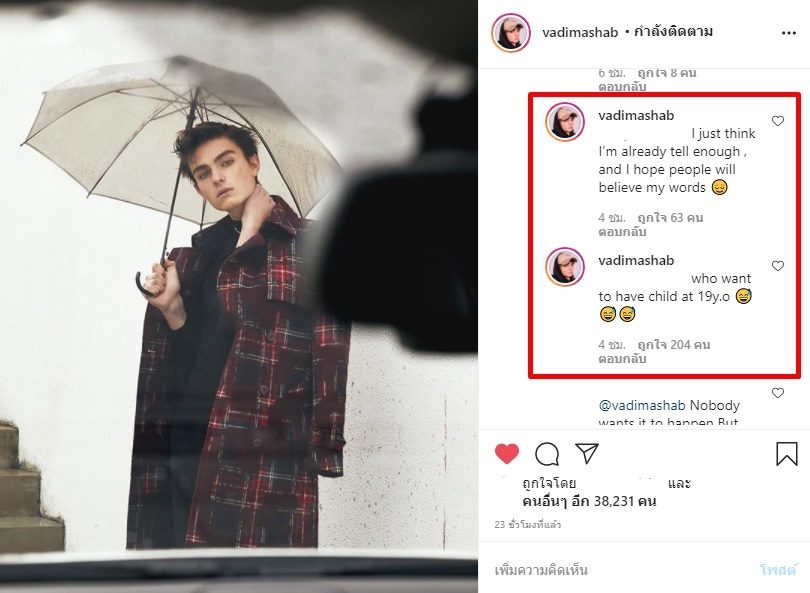 “ប្រជាជនថៃទាំងអស់ចង់ដឹងខ្លាំងណាស់ថា អ្នកកាន់តែនិយាយច្បាស់លាស់ប៉ុណ្ណាក៏កាន់ល្អសម្រាប់រឿងទាំងអស់នេះ មិនមែនចេះតែស្វែងរកអ្នកណាខុស តែដើម្បីឲ្យការផ្លាស់ប្ដូរទៅមុខល្អប្រសើរនិងត្រឹមត្រូវ ខ្ញុំចូលចិត្តការតស៊ូរបស់អ្នក ហើយអ្នកផ្សេងក៏មិិនចាំបាច់មកអង្គុយទាយ វាល្អសម្រាប់អ្នកគ្រប់គ្នា” ។ ដោយខាង Vadim បានតបទៅវិញថាៃ “ខ្ញុំថាខ្ញុំនិយាយច្រើនគ្រប់គ្រាន់ដែរហើយ ហើយខ្ញុំសង្ឃឹមថាអ្នកជឿសម្ដីរបស់ខ្ញុំ” ហើយនៅតប comment របស់អ្នកបណ្ដាញសង្គមដដែលម្ដងទៀតថា “អ្នកណាចង់បានកូននៅអាយុ 19ឆ្នាំនោះ”