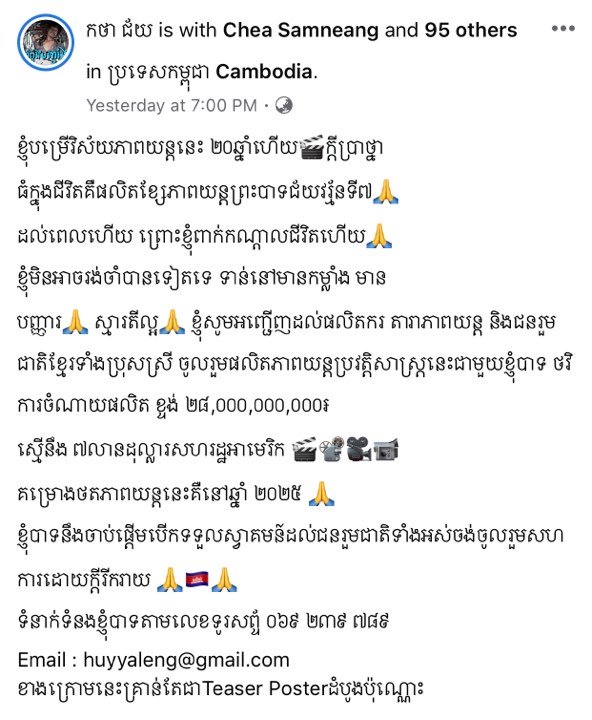 ក្នុងនោះលោកបានរៀបរាប់ថា «ខ្ញុំបម្រើវិស័យភាពយន្តនេះ ២០ឆ្នាំហើយ ក្ដីប្រាថ្នាធំបំផុតក្នុងជីវិតគឺផលិតខ្សែភាពយន្តព្រះបាទជ័យវរ្ម័នទី៧​ ដល់ពេលហើយ ព្រោះខ្ញុំពាក់កណ្ដាលជីវិតហើយ ខ្ញុំមិនអាចរង់ចាំបានទៀតទេ ទាន់នៅមានកម្លាំង មានបញ្ញា ស្មារតីល្អ ខ្ញុំសូមអញ្ជើញដល់ផលិតករ តារាភាពយន្តនិងជនរួមជាតិខ្មែរទាំងប្រុសស្រី ចូលរួមផលិតភាពយន្តប្រវត្តិសាស្រ្តនេះជាមួយខ្ញុំបាទ ថវិកាចំណាយផលិតខ្ទង់ ២៨,០០០,០០០,០០០៛ ស្មើនឹង ៧លានដុល្លារសហរដ្ឋអាមេរិក គ្រោងថតភាពយន្តនេះគឺនៅឆ្នាំ២០២៥ ខ្ញុំបាទនឹងចាប់ផ្ដើមបើកទទួលស្វាគមន៍ដល់ជនរួមជាតិទាំងអស់ចូលរួមសហការដោយក្ដីរីករាយ»។