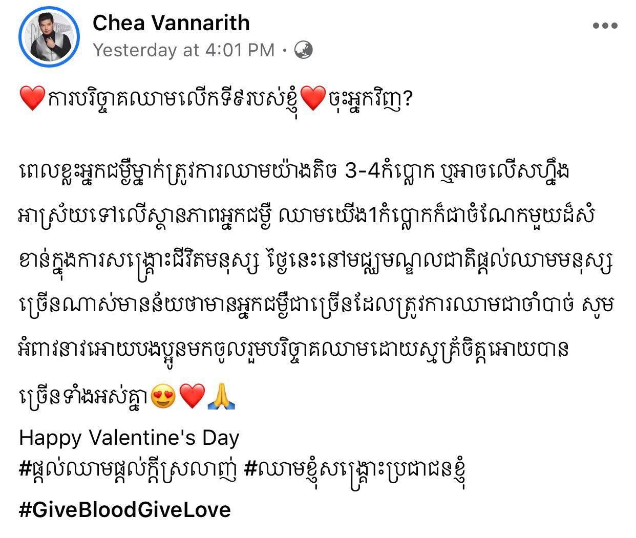 នេះជាសាររបស់លោក ជា វណ្ណារិទ្ធ «ការបរិច្ចាគឈាមលើកទី៩របស់ខ្ញុំ ចុះអ្នកវិញ? ពេលខ្លះអ្នកជំងឺម្នាក់ត្រូវការឈាមយ៉ាងតិច ៣-៤ កំប្លោក ឬអាចលើសហ្នឹង អាស្រ័យទៅលើស្ថានភាពអ្នកជំងឺ ឈាមយើង ១កំប្លោកក៏ជាចំណែកមួយដ៏សំខាន់ក្នុងការសង្គ្រោះជីវិតមនុស្ស ថ្ងៃនេះនៅមជ្ឈមណ្ឌលជាតិផ្ដល់ឈាមមនុស្សច្រើនណាស់ មានន័យថាមានអ្នកជំងឺ ជាច្រើនដែលត្រូវការឈាមជាចាំបាច់ សូមអំពាវនាវឲ្យបងប្អូនមកចូលរួមបរិច្ចាគឈាមដោយស្ម័គ្រចិត្តឲ្យបានច្រើនទាំងអស់គ្នា។ Happy Valentine’s Day ផ្ដល់ឈាមផ្ដល់ក្ដីស្រលាញ់ ឈាមខ្ញុំសង្គ្រោះប្រជាជនខ្ញុំ GiveBloodGiveLove»៕