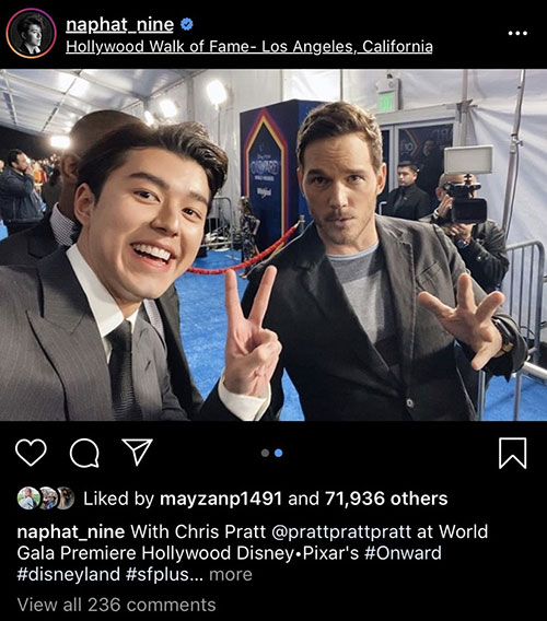លោក Nine Naphat បានចូលរួមក្នុងកម្មវិធីសម្ភោធន៍ខ្សែភាពយន្តគំនូជីវចលរឿង Onward នៅឯទីក្រុង Los Angeles សហរដ្ឋអាមេរិក។ ឆ្លៀតឱកាសដ៏កម្រមួយនេះលោក Nine Naphat ក៏បានថតរូបជាមួយលោក Christ Patt ។