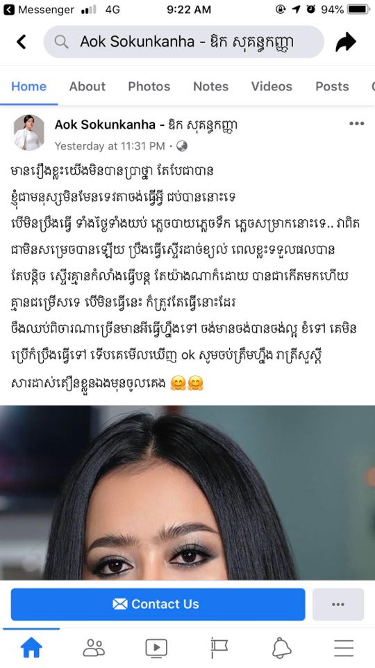 «មានរឿងខ្លះយើងមិនបានប្រាថ្នា តែបែជាបាន ខ្ញុំជាមនុស្សមិនមែនទេវតាចង់ធ្វើអ្វី ជប់បាននោះទេ បើមិនប្រឹងធ្វើ ទាំងថ្ងៃទាំងយប់ ភ្លេចបាយភ្លេចទឹក ភ្លេចសម្រាកនោះទេ.. វាពិតជាមិនសម្រេចបានឡើយ ប្រឹងធ្វើស្ទើរដាច់ខ្យល់ ពេលខ្លះទទួលផលបានតែបន្តិច ស្ទើរគ្មានកំលាំងធ្វើបន្ត តែយ៉ាងណាក៏ដោយ បានជាកើតមកហើយ គ្មានជម្រើសទេ បើមិនធ្វើនេះ ក៏ត្រូវតែធ្វើនោះដែរ ចឹងឈប់ពិចារណាច្រើនមានអីធ្វើហ្នឹងទៅ ចង់មានចង់បានចង់ល្អ ខំទៅ គេមិនប្រើក៏ប្រឹងធ្វើទៅ ទើបគេមើលឃើញ ok សូមចប់ត្រឹមហ្នឹង រាត្រីសួស្តី សារដាស់តឿនខ្លួនឯងមុនចូលគេង»។