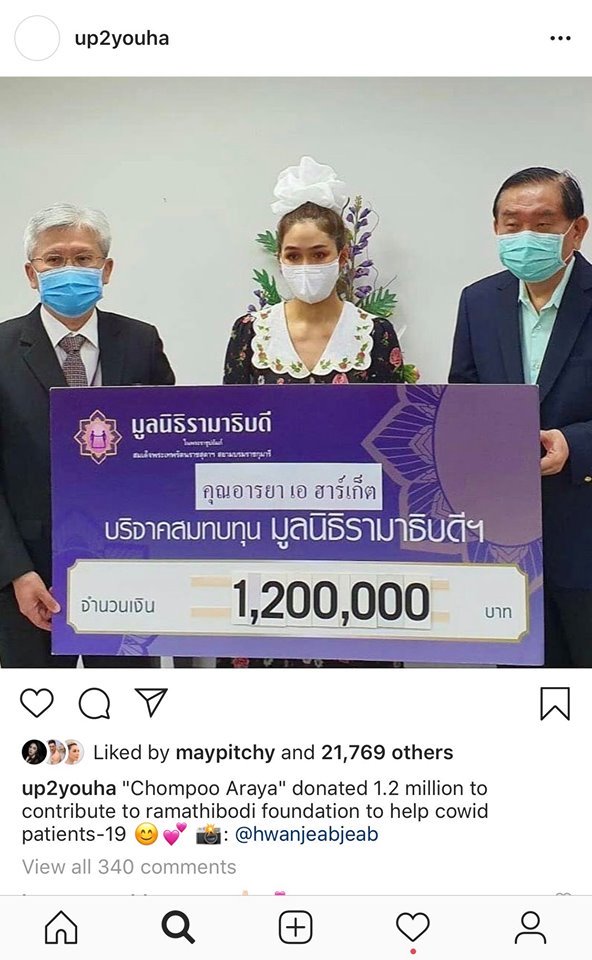 ជាក់ស្ដែងកាលពីពេលថ្មីៗនេះ តារាសម្ដែងថៃស្រីល្បីឈ្មោះ Chompoo Araya បានធ្វើឲ្យប្រជាជនថៃ ក៏ដូចជាហ្វេនៗជាច្រើនភ្ញាក់ផ្អើលដល់ទឹកចិត្តមនុស្សធម៍របស់តារាស្រីរូបនេះ ដោយក្នុងនោះនាងបានចូលលុយទៅមូលនិធី Covid-19 នេះចំនួន ១លាន ២សែន បាត ដែលស្មើរនិង 36,535ដុល្លារ។