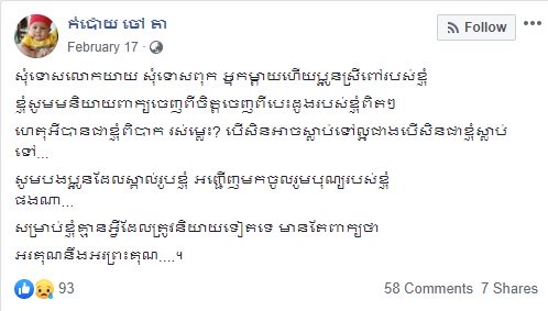 «សុំទោសលោកយាយ សុំទោសពុក អ្នកម្តាយ ហើយប្អូនស្រីពៅរបស់ខ្ញុំខ្ញុំសូមនិយាយពាក្យចេញពីចិត្តចេញពីបេះដូងរបស់ខ្ញុំពិតៗ