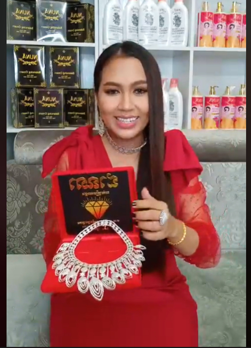 ជាមួយគ្នានោះ ទើបតែប្រកាសនូវការនាំចូលគ្រឿងសម្អាងប្រ៊េនថ្មីកាលពីថ្មីៗនេះ តារាពិធីការិនី មាស សុវណ្ណរតនា ហៅ “រតនា” ស្រាប់តែលេងបញ្ចេញសម្រស់ជាមួយគ្រឿងពេជ្រមួយឈុតធំទៀត នៅពេលឡាញលក់ផលិតផលរបស់នាង។ ការបញ្ចេញគ្រឿងពេជ្រមួយឈុតធំនេះ ត្រូវបាននាងបង្ហើបឱ្យដឹងថា តម្លៃក្បែរៗ២០ម៉ឺនដុល្លារ ដែលទើបទិញពីហាងពេជ្រ ទ្រី ដាណា កាលពីប៉ុន្មានថ្ងៃមុននេះ។