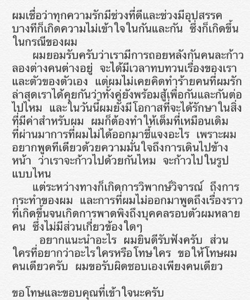 ក្នុងនោះលោក Gun បានរៀបរាប់ថា «ខ្ញុំជឿជាក់ថា រាល់សេចក្តីស្នេហា តែងតែមានពេលវេលាល្អហើយក៏មានឧបសគ្គ។ ពេលខ្លះ ក៏មិនយល់ពីគ្នា ដូចដែលបានកើតឡើង នៅក្នុងករណីរបស់ខ្ញុំ ខ្ញុំសារភាពថា យើងត្រូវដើរថយក្រោយមួយជំហានម្តងៗ សាកល្បងមើលអ្នកផ្សេង អាចនឹងមានពេលវេលា ដើម្បីពិនិត្យមើល រឿងរ៉ាវផ្ទាល់ខ្លួនរបស់យើង តែខ្ញុំមិនដែលគិតធ្វើបាបមនុស្សដែលខ្ញុំស្រលាញ់នោះទេ។ថ្មីៗនេះ ពួកយើងបាននិយាយគ្នាហើយថា យើងទាំងពីរនឹងត្រៀមខ្លួន ដើម្បីបន្តតស៊ូជាមួយគ្នា។ ហើយ ថ្ងៃនេះ ខ្ញុំនៅតែមានឱកាសថែរក្សារបស់ដ៏មានតម្លៃសម្រាប់ខ្ញុំផងដែរ។ ខ្ញុំត្រូវតែធ្វើឱ្យអស់ពីសមត្ថភាព។ ហើយកាលពីមុនមកនេះ ដែលខ្ញុំមិនបានចេញមកបង្ហាញអ្វី ព្រោះតែខ្ញុំចង់និយាយដោយភាពជឿជាក់ លើការដើរទៅមុខ ថាតើពួកយើងនឹងធ្វើបែបណា?
