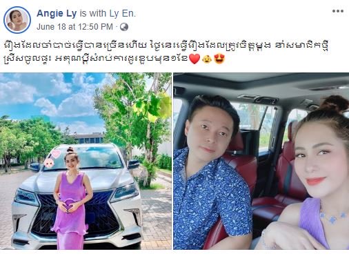 ជាក់ស្ដែងថ្មីៗនេះអ្នកនាងបានធ្វើឲ្យហ្វេនៗជាច្រើនកាន់តែភ្ញាក់ផ្អើលថែមទៀត នៅពេលអ្នកនាងបានបង្ហោះរូបភាពអមជាមួយនិងសារអរគុណទៅកាន់ស្វាមីខ្លួន ដែលបានទិញរថយន្តសេរ៊ីទំនើប ពណ៌ស ថ្មីស្រឡាង តម្លៃរាប់មឺុនដុល្លារ Surprise អ្នកនាងមុនថ្ងៃកំណើតមកដល់ ធ្វើឲ្យអ្នកនាងរំភើបចិត្តយ៉ាងខ្លាំងញញឹមបិទមាត់មិនជិននោះទេ។