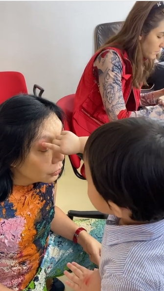 មើលទៅក្មេងៗដូចជាសប្បាយខ្លាំងណាស់ សើចសប្បាយចូលចិត្តតែងមុខឲ្យម៉ាក់យាយ លោកយាយក៏ស្រលាញ់ឆ្នូតមុខដែលក្មេងគូស ទើបព្រមឲ្យគូវាសពេញមុខ។