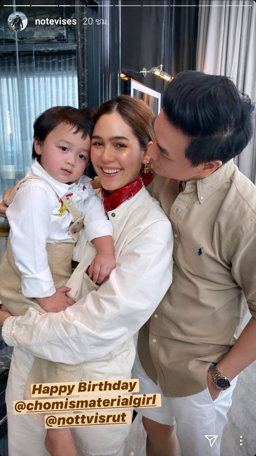 ក្រោយមកលោកប៉ាកំពូលសង្ហារ Witsarut ក៏បានផុសជូនពរតាមរយៈ Instagram ផ្ទាល់ខ្លួន @nottvisrut ដោយជ្រើសរើសរូបដែល Chompoo ឈរបង្អួតសម្រស់នៅលើតុអាហារដែលបានប្ដូរទៅជាកន្លែងរត់លេងរបស់កូនប្រុសភ្លោះរបស់នាងទាំងពីរ អត់ខ្វល់ទេអ្នកម៉ាក់ថតអីថតទៅសំខាន់អូនរត់លេងញញឹមសើចសប្បាយ។