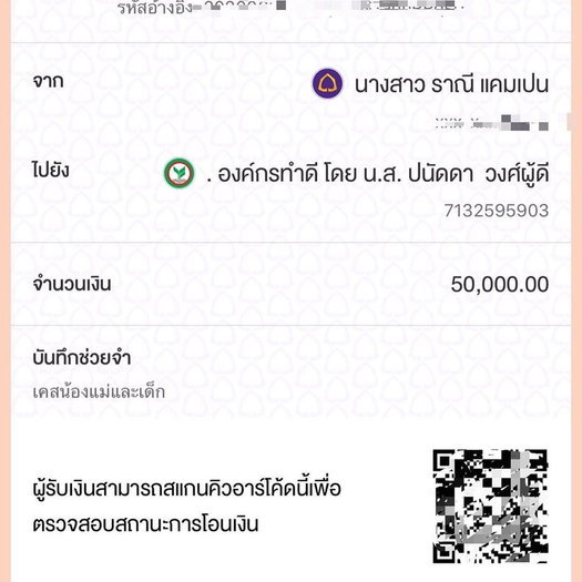 ដោយកញ្ញា Bom បានផុសរូបភាពរបស់ Bella រួមជាមួយនិងប័ណ្ណផ្ទេរប្រាក់លើ Instagram ព្រមទាំងបានភ្ជាប់ជាមួយឃ្លាថា៖ សូមឲ្យគ្រប់គ្នាបានទទួលអនុមោទនាផង អូនស្រី  Bella Ranee @bellacampen ដែលបានជួយដល់ក្មេងដែលខ្សោយស្មារតីហើយត្រូវតាចាប់រំលោភនិទើបតែសម្រាលកូនចំនួនទឹកប្រាក់ 50,000 បាត ($1250) ប្អូនបានជួយមកច្រើនណាស់ សូមអនុមោទនាប្អូនស្រី និងបានបែងចែកថវិការជួយមួយផ្នែកទៀតដែលត្រូវបានឪពុកបង្កើតចាប់រំលោភអស់រយៈពេល 5ឆ្នាំ។