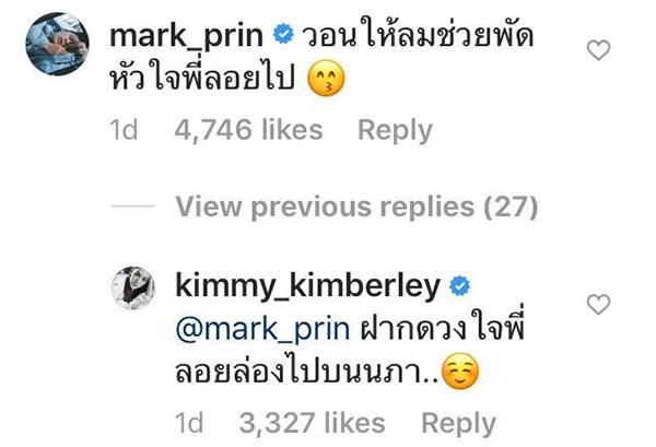 រឹតតែផ្អែម ព្រោះតែសង្សាសំណព្វចិត្តលោក Mark បានឆ្លើយតបទៅម្ចាស់ចិត្តវិញថា “សូមឲ្យខ្យល់បកយកបេះដូងបងទៅ” ធ្វើឲ្យកញ្ញា Kimberley ចូលមកបន្ថែមថា “ផ្ញើរបេះដូងមកឲ្យហោះហើរលើអាកាស”