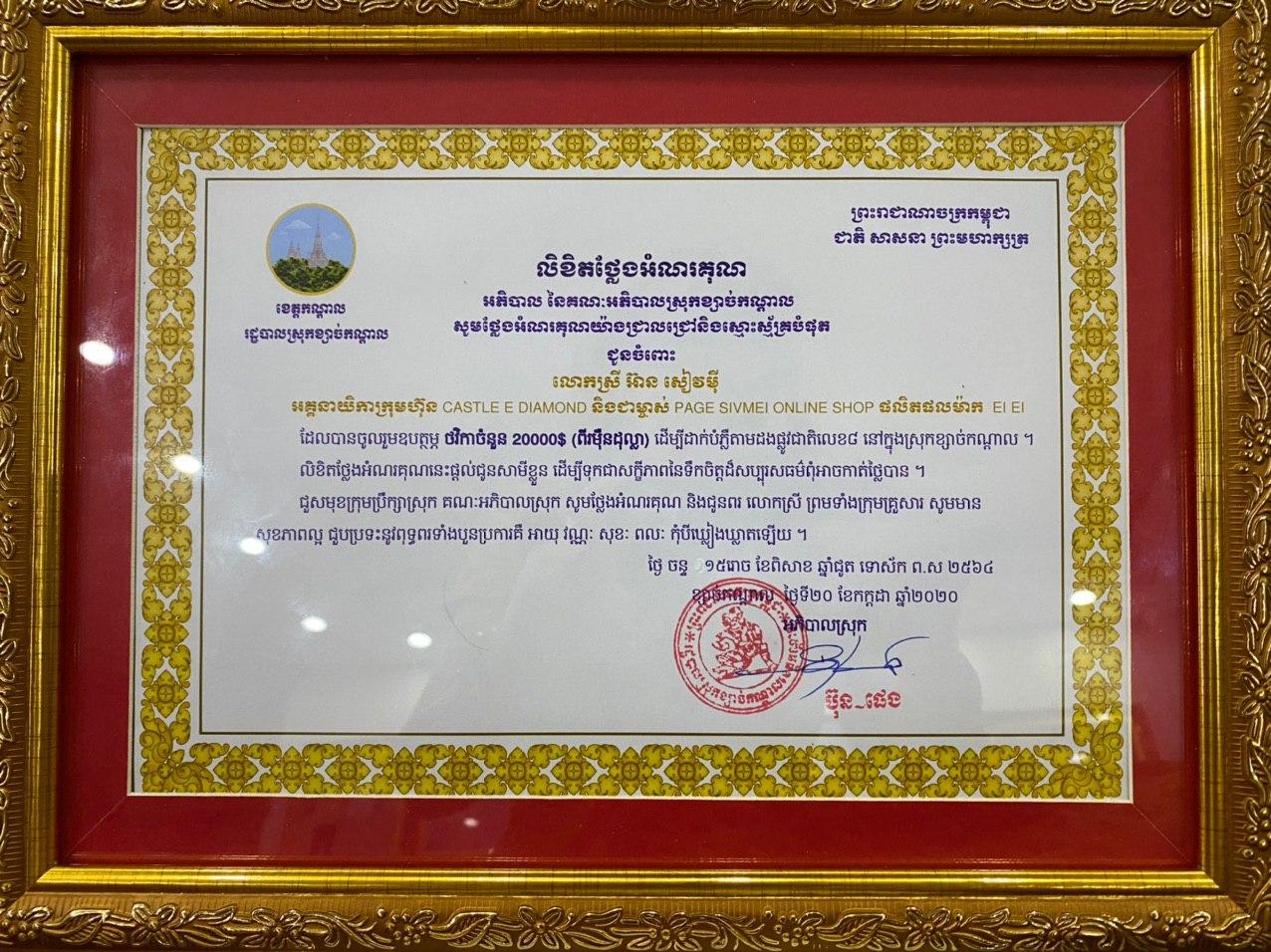 ម្ចាស់ផេក Siv Mey Online Shop តាមរយៈការបង្ហោះនៅលើហ្វេសប៊ុក បានបង្ហាញពីការចូលរួមយ៉ាងសកម្ម ព្រមទាំងនាំយកថវិកាចំនួន២ម៉ឺន(២០០០០)ដុល្លារអាមេរិក ទៅឧបត្ថម្ភដល់រដ្ឋបាលស្រុកខ្សាច់កណ្តាល ខេត្តកណ្តាល ដើម្បីដាក់អំពូលបំភ្លឺតាមដងផ្លូវជាតិលេខ៨ទាំងមូលក្នុងស្រុកខ្សាច់កណ្តាល កាលពីថ្ងៃទី២០ ខែកក្កដា ឆ្នាំ២០២០ ។