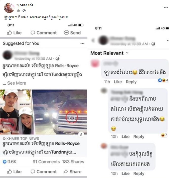 តែគ្រាន់តែលឺបែបនេះភ្លាម ក៏មានគណនីហ្វេសប៊ុកមួយផ្សេងទៀតបានតបទៅវិញថា «ដឹងមកពីណាបង់រំលោះ បើខាងខ្ញុំលក់ឲ្យគាត់ រាប់លុយសុទ្ធសោះហ្នឹង» តែងាកទៅមើសឪពុកតារាចម្រៀងប្រុសរូបនេះ វិញក៏បានបង្ហោះរូបភាពបង្ហាញពីសារឆ្លើយឆ្លងនេះ និងពោលពាក្យមួយឃ្លារថា «ខ្ញុំក្រោកពីគេង មានអារម្មណ៍ស្រស់ស្រាយ»។