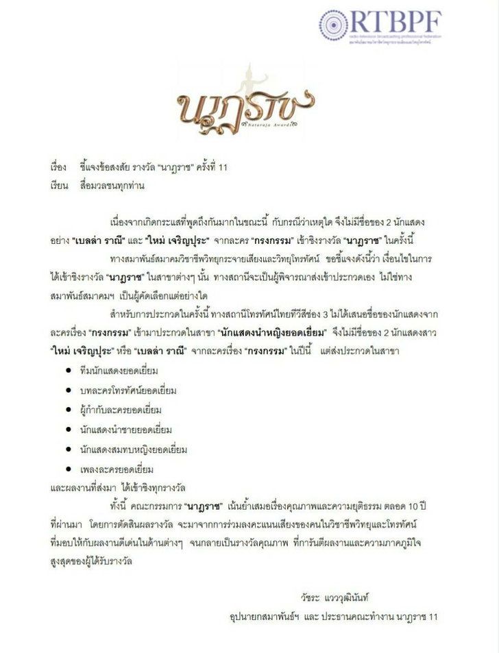 “នៅក្នុងខណៈនេះមានការវិនិច្ឆយ័ជាច្រើនជាមួយនិងករណីថាហេតុអ្វី បានជាមិនមានឈ្មោះអ្នកសម្ដែងស្រី2នាក់ Bella Ranee-Mai Charoenpura ពីរឿងភាព ក្រងកម្មមកចូលប្រកួតពានរង្វន់ Nataraj Awards លើកនេះ