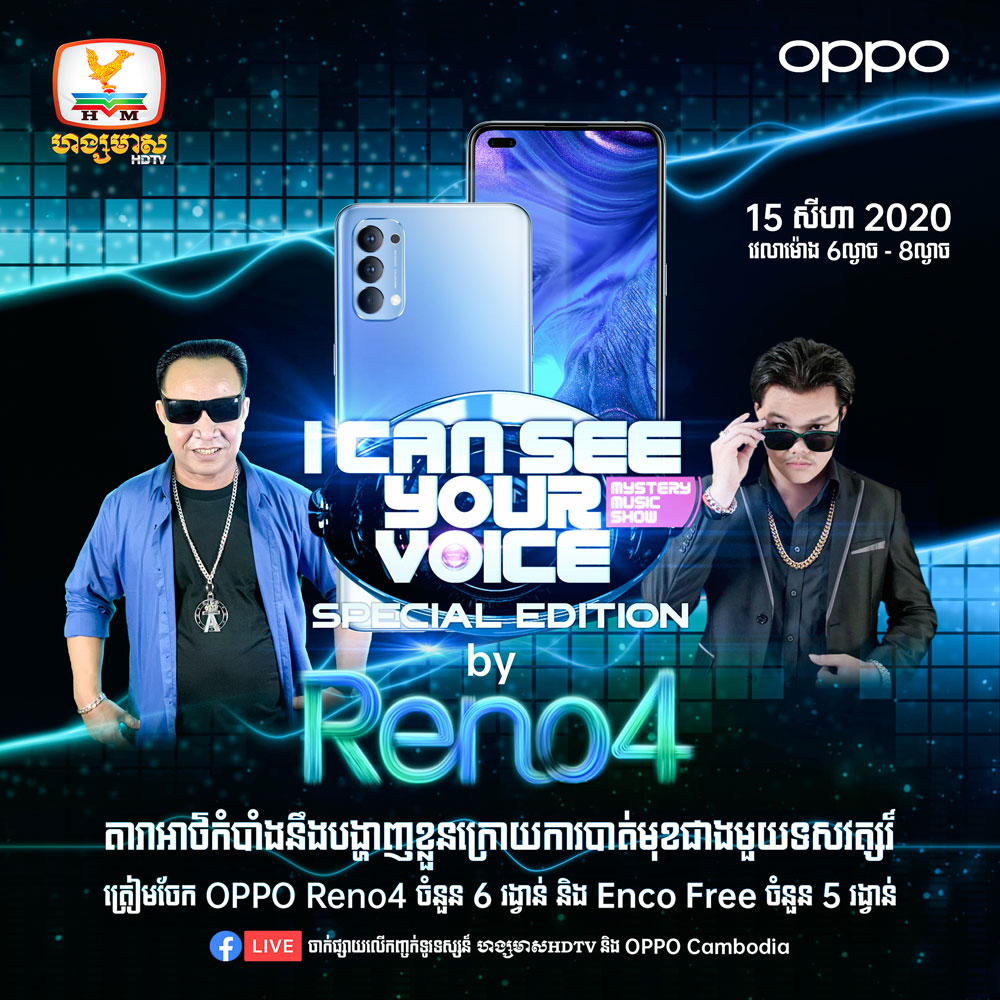 គួរបញ្ជាក់ផងដែរថា កម្មវិធី I Can See Your Voice Special Edition by OPPO ជាការរៀបចំឡើងដោយក្រុមហ៊ុន OPPO នឹងចាក់ផ្សាយនាថ្ងៃទី15 ខែសីហា ឆ្នាំ2020 វេលាម៉ោង 6ល្ងាចតទៅ នៅលើកញ្ចក់ទូរទស្សន៍ហង្សមាស និងផ្សាយផ្ទាល់តាមផេគហ្វេសប៊ុកផ្លូវការរបស់ក្រុមហ៊ុន OPPO ពិសេសមានការចូលរួមពីតារាល្បីៗជាច្រើនរូបដូចជា ពេជ្រ សោភា, Step, រ៉េត ស៊ូហ្សាណា, DJ Sdey, H.E.N.G, Raven Blaze, កែវ សុខផេង, ចេននី, និងលោក ហេង វាសនា ដែលធ្វើឲ្យកម្មវិធីសម្ពោធនេះរឹតតែប្លែកជាងកម្មវិធីសម្ពោធស្មាតហ្វូនដទៃ និងជាចំណីចក្ខុថ្មីមិនធ្លាប់មានពីមុន ដើម្បីអបអរការចេញលក់ជាផ្លូវការនូវស៊េរីថ្មី OPPO Reno4។ ដូច្នេះ កុំភ្លេចតាមដានទស្សនា ដាក់ម៉ោងរោទិ៍ កម្មវិធីសម្ពោធអនឡាញស្មាតហ្វូនស៊េរីថ្មីនេះនៅយប់ថ្ងៃទី15 ខែសីហា តាមទូរទស្សន៍ហង្សមាស និងផ្សាយផ្ទាល់ផេកហ្វេសប៊ុកផ្លូវការ OPPO។ លោកអ្នកនឹងមានឱកាសឈ្នះរង្វាន់ជាច្រើនរួមមាន៖ ទូរស័ព្ទ OPPO Reno 4 ចំនួន 6 រង្វាន់ កាសឥតខ្សែ Enco Free ចំនួន 5 រង្វាន់ ដោយគ្រាន់តែទស្សនាការ Live, Comment និង Share អំឡុងពេល Live ផ្ទាល់។