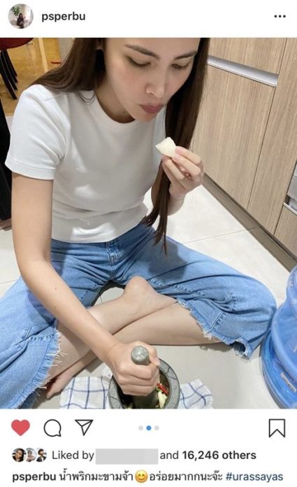 ចំណែកឯម៉ែ Pla បានផុសរូបបុកទឹកគ្រឿងរបស់កូនស្រីព្រមទាំងធានានូវរសជាតិថា “ទឹកគ្រឿងអំពិលទុំចា ? ពិតជាឆ្ងាញ់មកៗៗៗ #urassayas”  សកម្មភាពនេះធ្វើឲ្យហ្វេនៗអ្នកគាំទ្រសរសើរពីសកម្មភាពលេងសើចពេលបុកគ្រឿងពិតជាគួឲ្យស្រលាញ់ខ្លាំងណាស់ ថែមទាំងមានលួចចំអន់លេងទៀតថា …..ពូកែយ៉ាងនេះអាចមានគ្រួសារបានហើយ!!!