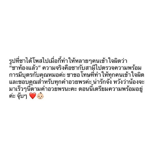 “រូបដែល Cha បានផុសទៅមុននិងធ្វើឲ្យគ្រប់ៗគ្នាមានការយល់ច្រលំថា Cha មានផ្ទៃពោះ តាមពិតទៅគឺ Cha និងស្វាមីទៅពិនិត្យសុខភាពក្នុងការត្រៀមយកបុត្រជាមួយគ្រូពេទ្យ Cha សូមអភ័យទោសដែលធ្វើឲ្យគ្រប់គ្នាយល់ច្រលំ ហើយក៏សូមអគុណសម្រាប់ពាក្យជូនពរទាំងអស់ គួឲ្យស្រលាញ់ណាស់ សង្ឃឹមថាអូននិងមកឆាប់ៗនេះ មកតាមពាក្យជូនពរណាចា ពេលនេះត្រៀមខ្លួនរួមហើយចា ចុបៗៗ”