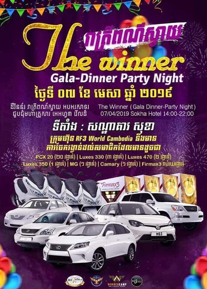 កម្មវិធីពិសេសជប់លៀងលើកទឹកចិត្តដល់សមាជិកទាំងអស់ ដែលខំប្រឹងបំពេញការងារ និងបានគ្រប់លក្ខខណ្ឌនៃផែនការណ៍របស់ក្រុមហ៊ុន RF3 World នោះ លោក វណ្ណ សុភានោ អគ្គនាយកក្រុមហ៊ុន Rf3 World Cambodia ធ្វើតាមសន្យាប្រារព្ធពិធីធំឱ្យ ដោយធ្វើការចែកជូនរង្វាន់ម៉ូតូស៊េរីថ្មី និងរថយន្តទំនើបៗ ដល់តំណាងចែកចាយដែលជោគជ័យបំពេញភារកិច្ចបានល្អពីឆ្នាំ២០១៨រហូតមកដល់២០១៩នេះ។