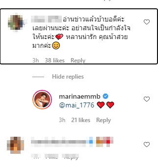 ជាក់ស្ដែង Marina បានចេញមកបកស្រាយដោយការផុសរូបខ្លួនឯងជាមួយនិងក្មួយស្រី Miya ព្រមជាមួយ caption ថា ” Miya ប្រាប់ច្បាស់ហើយណា” ហើយ Pok ដែលជាបងថ្លៃនាងចូលមក comment លើរូបថា “យ៉ាងម៉េចវិញ”
