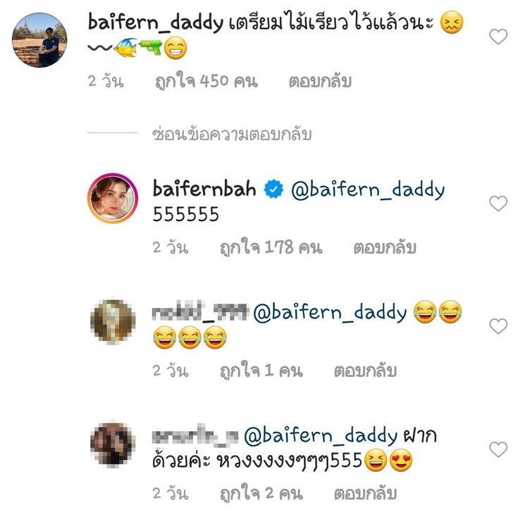 ហើយរឿងនេះ Baifern មិនបានងើបមកបញ្ចេញភាពស៊ិចស៊ីខ្លាំងដូចតារាដទៃទេ តែស្បែកដ៏សរនិងម៉ត់រលោងនិងគឺពេញ 10តែម្ដង 10ពិន្ទុដោយគ្មានខ្វះ។ រហូតធ្វើឲ្យលោកប៉ាជាទីស្រលាញ់ត្រូវបញ្ចេញភាពកាចចូលមក comment  “ត្រៀមដំបងឲ្យហើយទៅវ៉ៃហើយណា” ប្រកាសយ៉ាងច្បាស់ថាបារម្ភកូនស្រីចេញមុខចេញមាត់លើបណ្ដាញសង្គមហើយចា