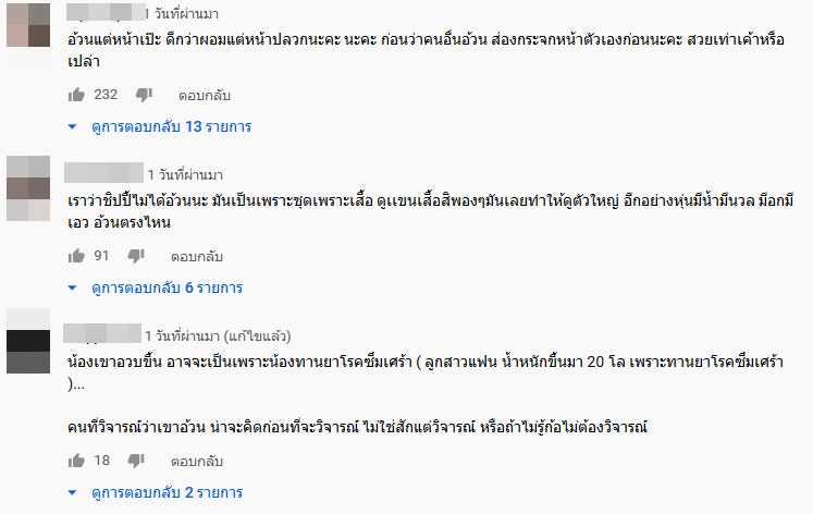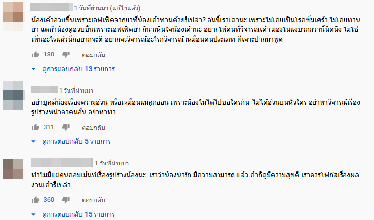 ពាក្យទាំងអស់នេះធ្វើឲ្យអ្នកគាំទ្រនាងមួយផ្នែកទៀតចេញមកតតាំងជំនួសឆ្លើយតបវិញថា មិនគួមករិះគន់រូបរាងមុខមាត់របស់អ្នកដទៃទេ មិនថាម្នាក់នោះជាតារាឬមិនមែនក៏ដោយមិនត្រូវមកមើលងាយរិះគន់រូបរាងមុខមាត់គេទេ ដោយអ្នកផ្សេងទៀតគេយល់ឃើញថាអាចជាមកពីថ្នាំព្យាបាលរោគសោកសៅ អ្នកគ្មានសីលធម៌សោះដូចពួកមនុស្សមាត់ឆ្កែចឹង គួតែមើលពីលទ្ធផលការងាររបស់នាងបានត្រូវ