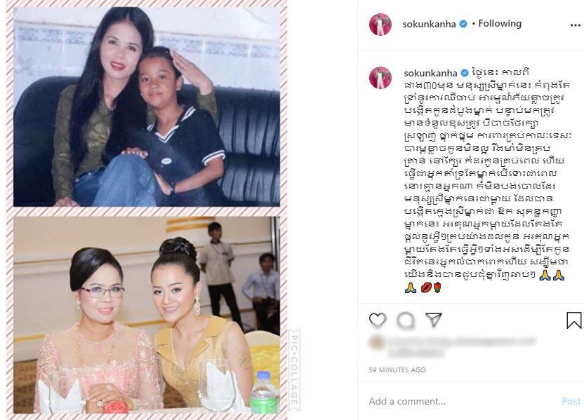 «ថ្ងៃនេះ កាលពីជាង ៣០មុន មនុស្សស្រីម្នាក់នេះ កំពុងតែទ្រាំនូវការឈឺចាប់ អារម្មណ៍ភ័យខ្លាចត្រូវបង្កើតកូនដំបូងម្នាក់ បន្ទាប់មកត្រូវមានទំនួលខុសត្រូវ បីបាច់ថែរក្សា ស្រឡាញ់ ថ្នាក់ថ្នម ការពារគ្រប់កាលៈទេសៈ បារម្ភខ្លាចកូនមិនល្អ រឹងមាំមិនគ្រប់គ្រាន់ នៅក្បែរ កំដរកូនគ្រប់ពេល ហើយធ្វើជាអ្នកគាំទ្រតែម្នាក់ បើទោះជាពេលនោះគ្មានអ្នកណា ក៏មិនបង់ចោលដែរ មនុស្សស្រីម្នាក់នេះជាម្ដាយ ដែលបានបង្កើតក្មេងស្រីម្នាក់ជា ឱក សុគន្ឋកញ្ញា ម្នាក់នេះ អរគុណអ្នកម្តាយដែលតែងតែផ្តល់នូវអ្វីៗគ្រប់យ៉ាងដល់កូន អរគុណអ្នកម្ដាយតែងតែធ្វើអ្វីៗទាំងអស់ដើម្បីតែកូន ជីវិតនេះអ្នកលំបាកពេកហើយ សង្ឃឹមថាយើងនិងបានជួបជុំគ្នាវិញឆាប់ៗ»។