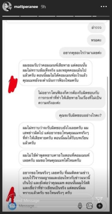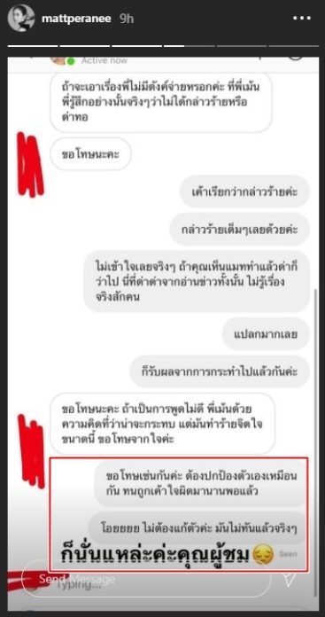 តែក្នុងរឿងនេះក៏មានអ្នកខ្លះបានដឹងកំហុសបានចូលឆាតមកសុំទោសនាង ខ្លះប្រាប់ថាគ្មានលុយបង់ការប្ដឹងហើយអ្នកខ្លះទៀតនិយាយផ្សេងៗ ដោយកញ្ញា Matt Peranee ក៏បានបង្ហាញពីរការឆ្លើយតបចំពោះអ្នកទាំងអស់នោះវិញថា “សុំទោសដូចគ្នាចា ត្រូវការពារខ្លួនឯង ទ្រាំក្នុងការយល់ច្រឡំមកច្រើនហើយ” , “អូយៗៗៗ មិនបាច់ចាំមកកែខ្លួនអីទេ វាលែងទាន់ពេលហើយពិតមែន” ព្រមទាំងប្រាប់ទៀតថា “ក៏បែបនិងហើយទស្សនិចជន”