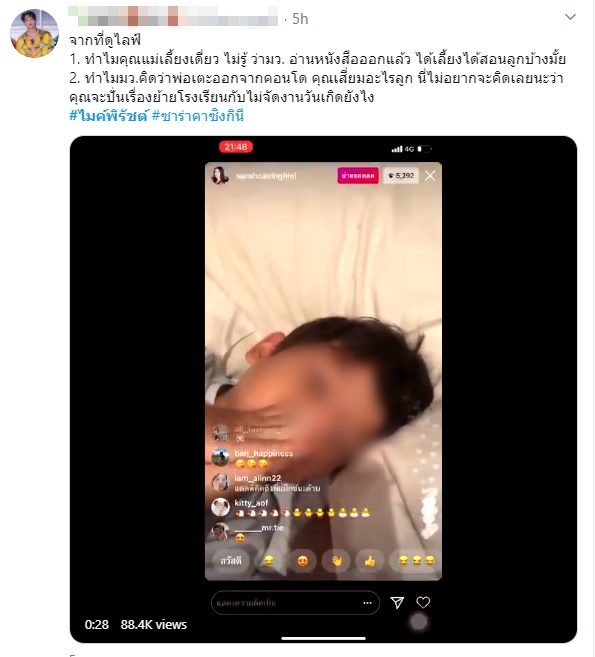 នៅក្នុង Twitter មានការរិះគន់ច្រើនចំពោះការឡាយនេះ ព្រោះឃើញថា Sara បានបិត IG ផ្ទាល់ខ្លួនតាំងតែពីមានរឿងរិះគន់នេះកើតឡើង តែបែរជាមកបើកវិញនៅពេលឡាយនេះទៅវិញ ព្រមទាំងបានឃើញទៀតថាក្រោយពេលអូន Maxwell និយាយដល់លោកប៉ា ហើយត្រូវ Sara បង្គាប់មិនឲ្យនិយាយ អូនគាត់បានប្រាប់ទៀតថា ម៉ាក់អោបតិចមក ក្រោយមកបាននៅស្ងៀមហើយយកដៃបិតមុខដូចជាកំពុងយំ តែ Sara នៅឡាយមិនព្រមបិទ