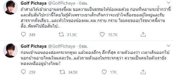 Golf នៅបន្ដទៀតថា “បើខាងតុលាកាបានចូលមើលចូលមកអានត្រង់នេះខ្ញុំសូមភាពយុត្តធម៌ឲ្យប្អូនប្រុសខ្ញុំផង មុននិងក្មួយរបស់ខ្ញុំកាន់តែខូចចិត្តនិងកាន់តែយល់ច្រលំខ្លាំងជាងនេះ ដោយមិនដឹងខ្លួនព្រោះគាត់នៅក្មេងខ្លាំងពិបាកនិងយល់រឿងរបស់មនុស្សចាស់ហើយទទួលពត៌មានតែម្ខាង…..ហើយបេះដូងរបស់ប្អូនខ្ញុំ …..ខ្ញុំសូមអង្វរៗ មិនដែលសុំអ្វីបែបនេះតាមការផ្សព្វផ្សាយទេ……សរសេរបណ្ដើញ័រដៃបណ្ដើរ…..” ហើយអ្នកបណ្ដាញសង្គមចូលមកមើលហើយcomment ផ្ដល់យោបល់ជាច្រើន