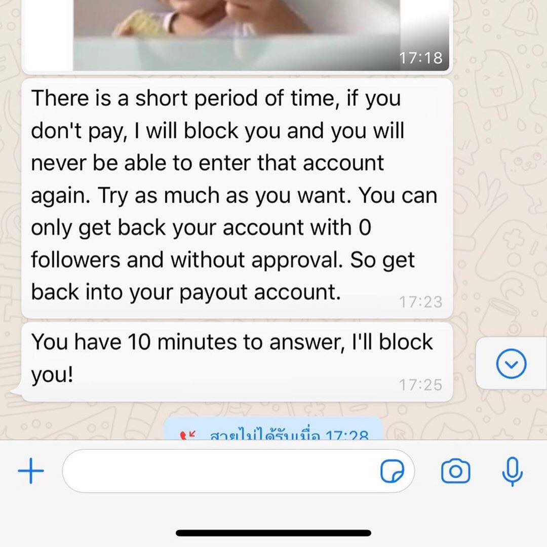 មិនត្រឹមតែប៉ុនណោះ ជនអនាមិកទាំងនេះ ថែមទាំងគំរាមនាងទៀតថា ប្រសិនបើមិនផ្ញើរប្រាក់ឲ្យគេនោះទេ ពួកគេនិងលុបគណនីអុីនស្ដារក្រាមរបស់នាងចេញថែមទៀត។
