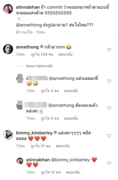ជាក់ស្ដែងលោក A Tinphan បានផុសសារបង្អាប់ Ann ថា “បើ commit ចាចេញមកមុខមាត់បែបនេះនិងព្រមរៀបការ5555555555@annethong ផ្ញើរូបមកសួរ? ចាប់អារម្មណ៍ទេ???” រហូតដល់ថ្នាក់ Ann ចេញមុខមកឆ្លើយតប comment ថា “ហ៊ានមែនទែន”