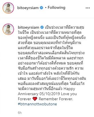 យ៉ាងណាមិញសម្រាប់ការអបអរថ្ងៃគម្រប់ខួបអាពាហ៍ពិពាហ៍១ឆ្នាំ ក្នុងនោះគ្រប់គ្នាបានឃើញ តារាស្រី Bitoey បានបង្ហោះសាររៀបរាប់យ៉ាងមានអត្ថន័យ ទៅកាន់ស្វាមីថា៖