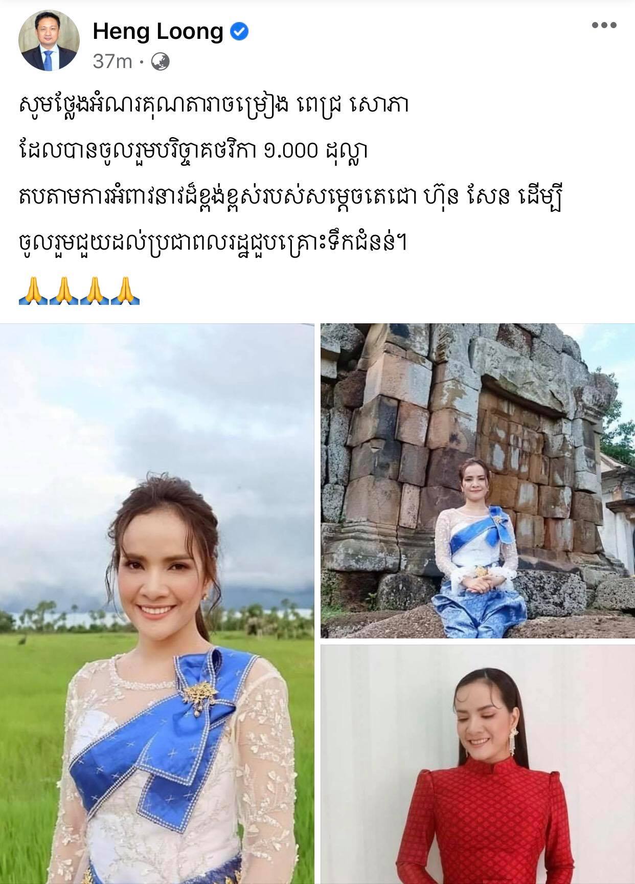 ប្រិយមិត្តជាច្រើនប្រាកដជាស្គាល់ហើយ តារាចម្រៀងស្រីល្បីឈ្មោះអ្នកនាង ពេជ្រ សោភា ដែលតែងតែទទួលបានការគាំទ្រយ៉ាងខ្លាំងពីសំណាក់មហាជន ហើយកន្លងមកគ្រប់គ្នាក៏ស្រលាញ់ពីទឹកចិត្តដ៏ល្អរបស់អ្នកនាង នៅក្នុងការងារសប្បុរសធម៍ជាច្រើនផងដែរ។