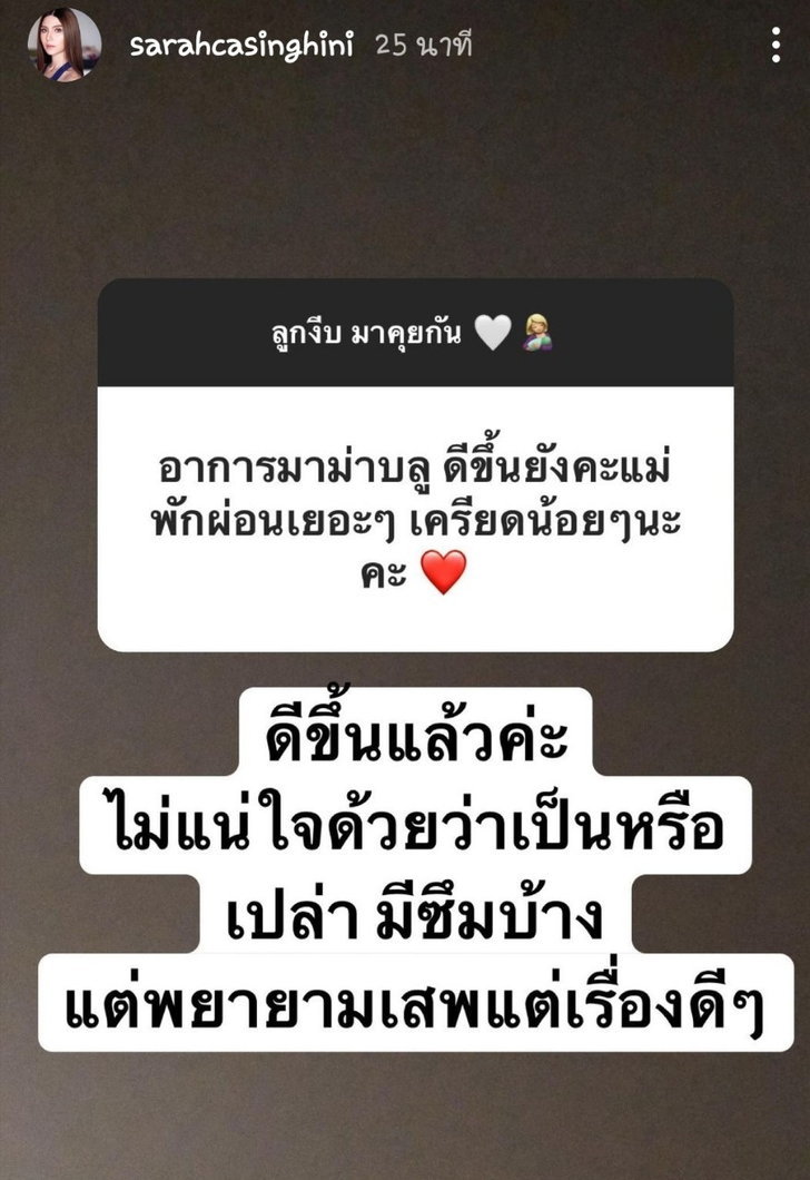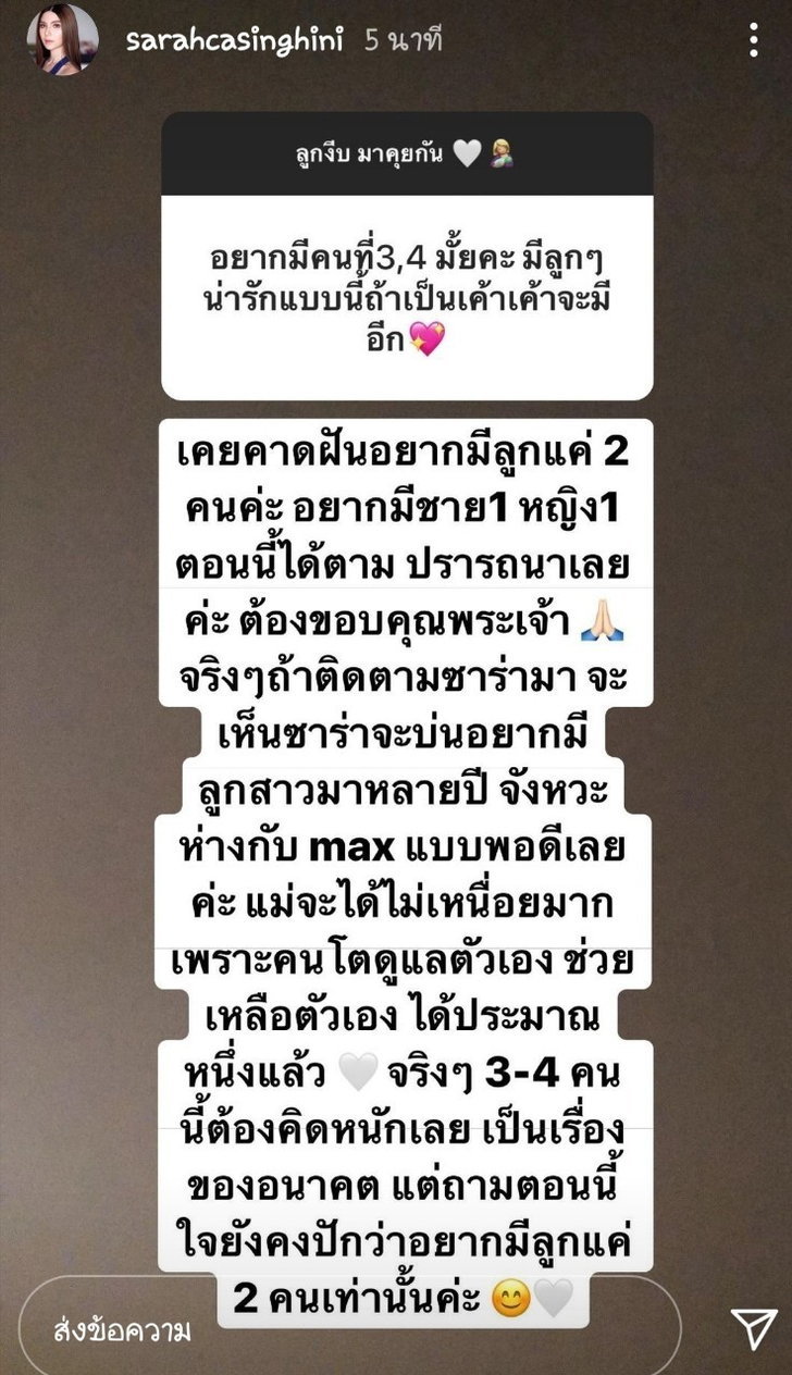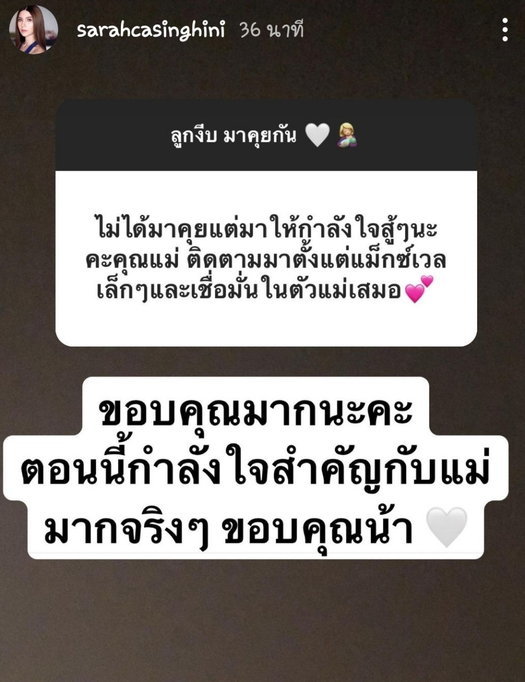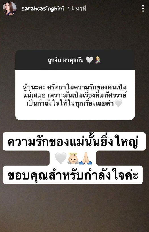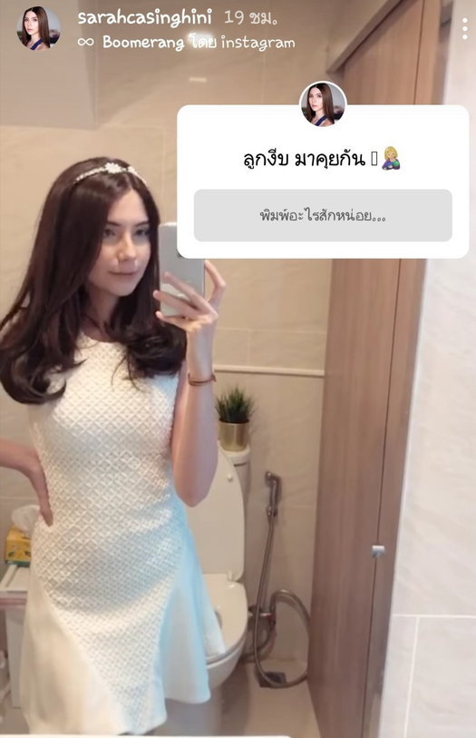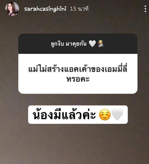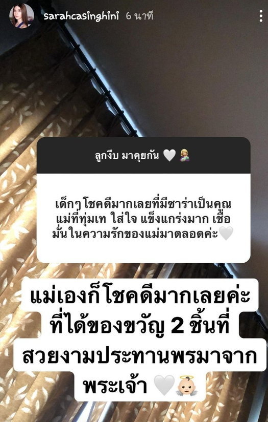 ដោយជាក់ស្ដែង នៅពេលល្ងាចថ្ងៃទី 25 សីហា 2020 Sarah បានឆ្លៀតឪកាសល្អ បើក Space នៅក្នុង IG story @sarahcasinghini ដើម្បីឲ្យគ្រប់គ្នាចូលមកជជែលនិយាយលេងព្រមទាំងសួរនូវសំណួរដែលមាននៅក្នុងចិត្ត នៅក្រោមរូបភាពគួឲ្យស្រលាញ់ៗស្ទាយអ្នកម៉ាក់កូនខ្ចី “កូនស្ងាត់ហើយ មកនិយាយគ្នាលេង”
