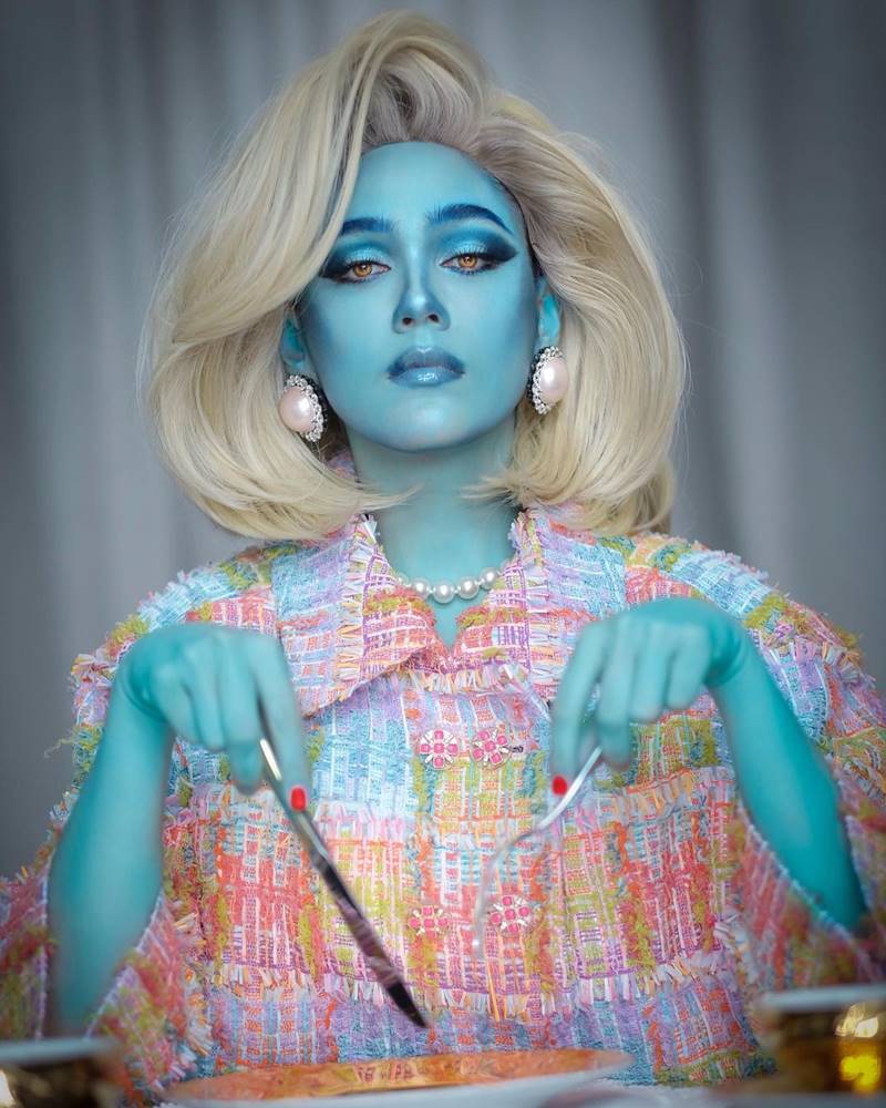 ក្នុងនោះផងដែរ នាឱកាសបុណ្យ Halloween កាលពីថ្ងៃទី ៣១ ខែ តុលា កន្លងទៅនេះ Chompoo មិនបានធ្វើឲ្យហ្វេនគ្រប់គ្នាអស់សង្ឃឹមនោះទេ ពោលគឺនាងបានតុបតែងខ្លួន ជាមួយនឹងផ្ទៃមុខ និងស្បែកខ្លួនពណ៌ខៀវ ពាក់សក់ពណ៌ទង់ដែងនិងសម្លៀកបំពាក់ដែលមានពណ៌ចម្រុះ មើលឡើងប្លែកសឹងតែមិនស្គាល់។