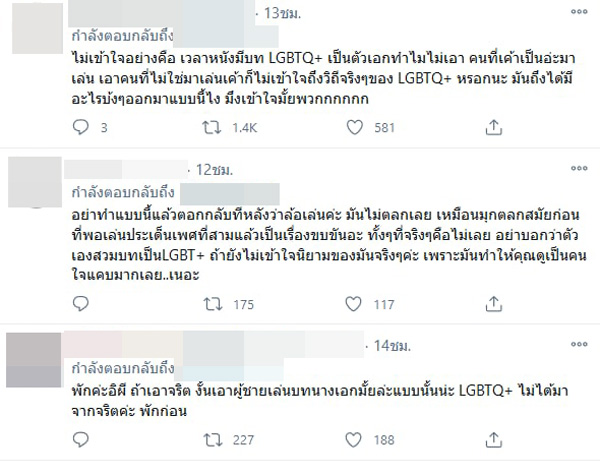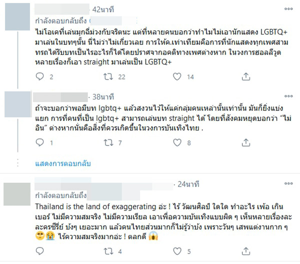 រឿងនេះអ្នកបណ្ដាញសង្គមនៅរិះគន់ចំពោះរឿងជ្រើសរើសអ្នកសម្ដែងជា LGBTQ+ ទៀតផង គ្មានភាពស្មើរគ្នា ថាបើចង់សម្ដែងជា LGBTQ+ (ស្រីកែភេទ) គួឲ្យយកអ្នកដែលជា LGBTQ+ ពិតៗមកសម្ដែងដើម្បីឲ្យដូចមែនទែន ព្រោះតារាសម្ដែងស្រីមួយចំនួនដូចជាដាក់ចិត្តដាក់អារម្មណ៍ខ្លាំងពេក ព្រោះជាធម្មតា LGBTQ+ ឬនារីភេទទីពីរខ្លះក៏មិនបានមានចិត្តធំថ្លើមធំអីដល់ថ្នាក់និង សម្លឹងឃើញថាតារាសម្ដែងខ្លះមិនយល់ពីអ្វីជា LGBTQ+ ពិតប្រាកដនោះទេ