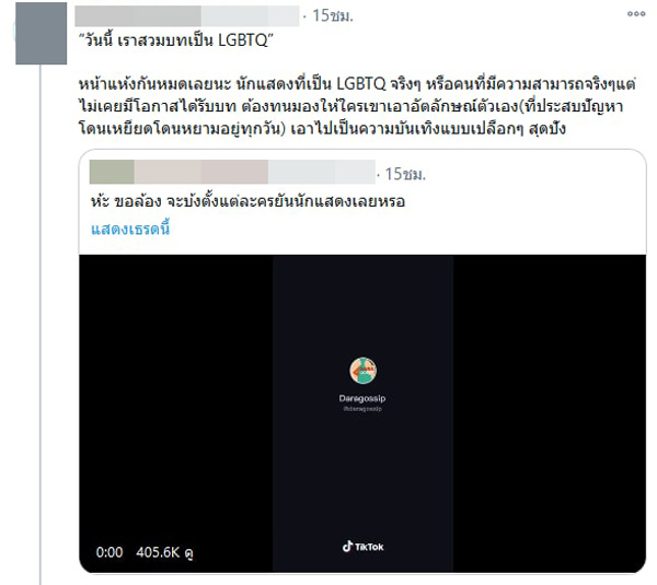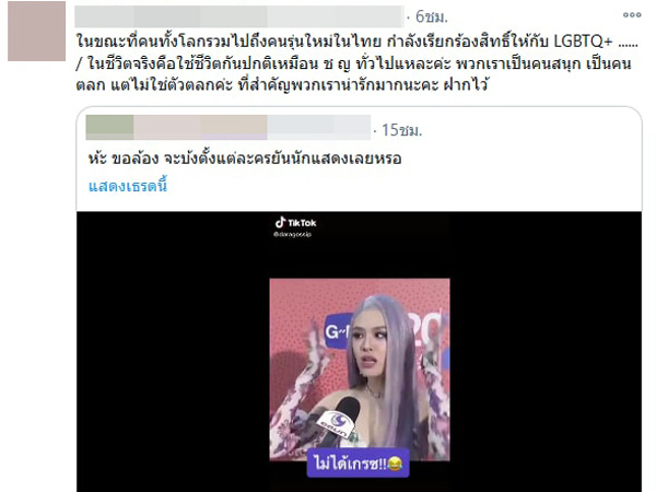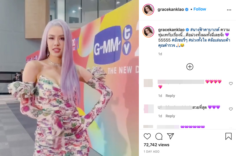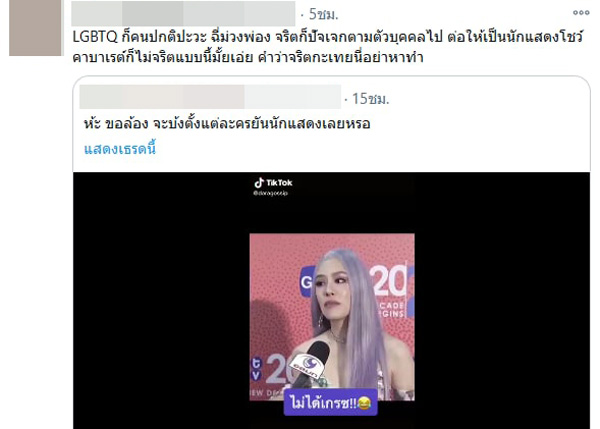 ជាក់ស្ដែងក្នុងពេលថ្មីៗនេះក៏កើតដ្រាម៉ាការរិះគន់គ្រប់បែបយ៉ាង នៅពេលមានបទសម្ភាសន៍របស់តារាស្រី Grace – Karnklao នៅថ្ងៃបើកសម្ភោធរឿងរភង Cabaret angel ពីអារម្មណ៍ដែលបានទទួលសម្ដែងជានារីភេទទីពីរ ដោយសាម៉ីខ្លួនផ្ដល់បទសម្ភាសន៍បែបលេងសើចថា “ថ្ងៃនេះយើងទទួលសម្ដែងជា LGBTQ ដូច្នេះហើយសក់យើងក៏ត្រូវតែពណ៌ស្វាយ នោមយើងក៏ត្រូវតែស្វាយដែរ” មុននិងសើចហើយប្រាប់ថា “និយាយលេងទេ”