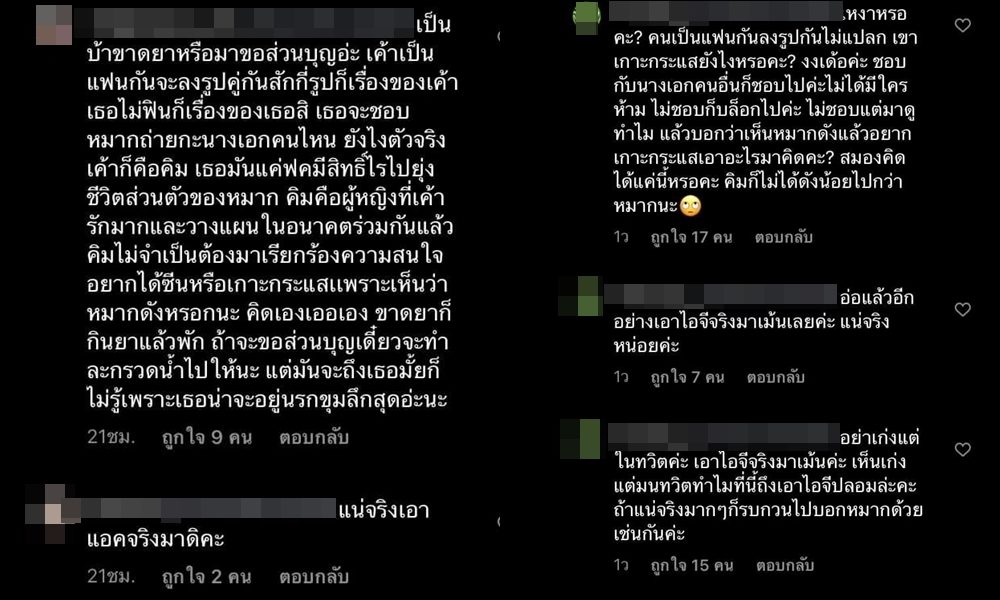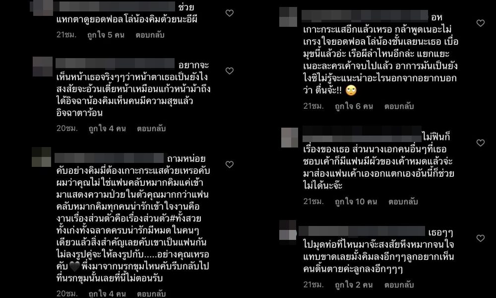 តែមិនទាំងអស់នោះទេព្រោះថាមានអ្នកបណ្ដាញសង្គមខ្លះចូលទៅបញ្ចេញមតិយោបល់ថា “ផ្ដាំប្រាប់ស្រីម្នាក់និងផងថា រំខានរឿងផុសរូបគូជាមួយ Mark និងខ្លាំងណាស់ ពួកយើងជាអ្នកគាំទ្ររបស់ Mark មិនពេញចិត្ត យើងចូលចិត្ត Mark ជាមួយនិងតួស្រីដទៃច្រើនជាង ចូលចិត្តទាមទារចំណាប់អារម្មណ៍ខ្លាំងណាស់ ចង់តោងឈ្មោះ Mark មែន ឃើញ Mark ល្បីហើយចង់តោងកន្ទុយមែនទេ” ធ្វើឲ្យអ្នកគាំទ្រដែលស្រលាញ់ Kimberly ចាត់ការវិញជាឈុតធំ រហូតដល់ comment ខាងលើបានលុបបាត់ទៅ