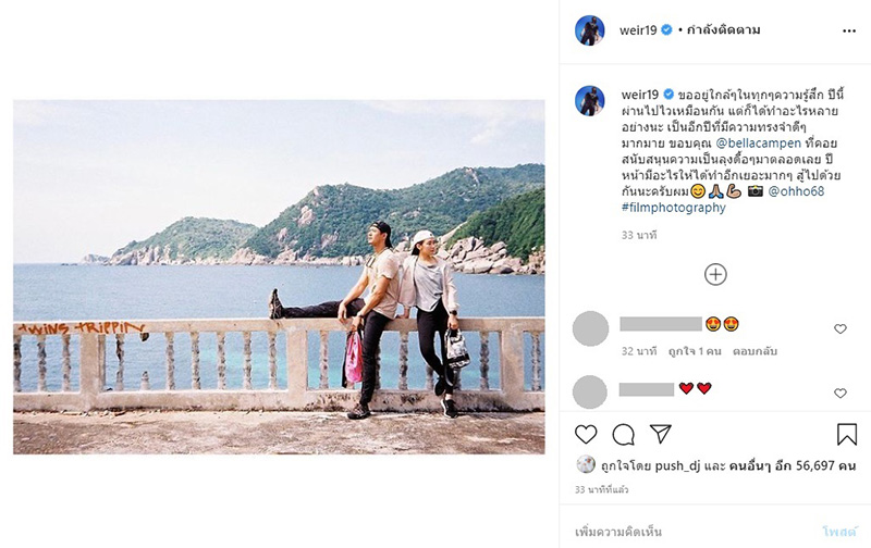 ខណៈដែលអ្នកកំលោះម្ចាស់ចិត្ត Weir Sukonwat បានផុសរូបភាពគូ ព្រមមកជាមួយនិង caption ជូនពរ Bella ថា “សុំនៅក្បែរៗនិងគ្រប់ៗអារម្មណ៍ ឆ្នាំនេះកន្លងផុតទៅលឿងដូចគ្នា តែក៏បានធ្វើអ្វីៗច្រើនយ៉ាង ជាឆ្នាំដែលមានការចងចាំល្អជាច្រើន អគុណ @bellacampen ដែលចាំជួយគាំទ្រនិងទ្រពូក្បាលឌឺមករហូត ឆ្នាំមុខមានអ្វីឲ្យធ្វើច្រើនណាស់ ស៊ូទៅជាមួយគ្នាណា”