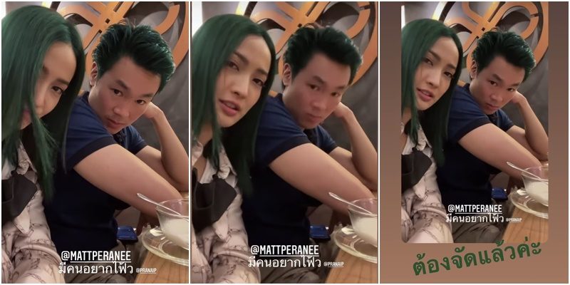 ជាក់ស្ដែងកញ្ញា Taew បានដឹកដៃសង្សាលោក Pranai មកញុំាបាយហើយបានបង្ហាញពណ៌សក់ពណ៌បៃតងគូជាមួយនិងម្ចាស់ចិត្ត ដោយនាងបានផុសវីឌីអូខាងលើតាមរយៈ IG story ហើយបាន tag ឲ្យបងស្រី Matt និងឃ្លាថា “មានអ្នកចង់ប្រយុទ្ធ” នៅក្នុងខណៈពេលជាមួយគ្នានេះដែលកញ្ញា Matt បានចូលមកឃើញ ក៏ផុសសារតបវិញថា “ត្រូវតែចាត់ការហើយបានៗចា”