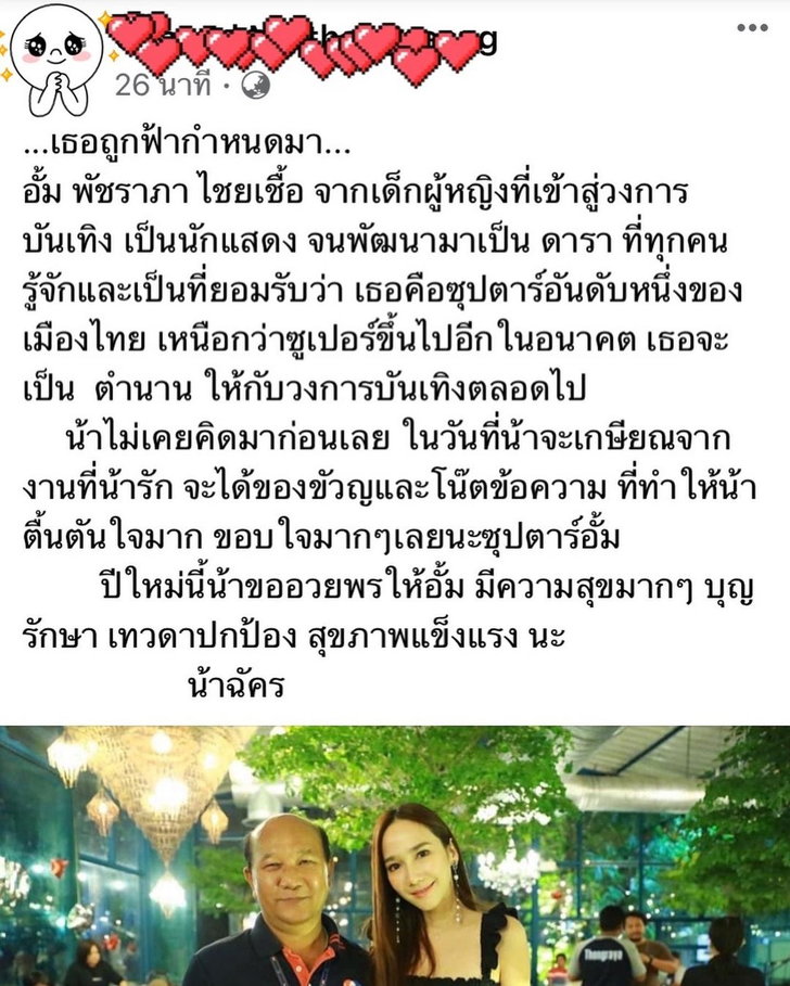 ត្រូវនិយាយថាក្រៅពីភាពស្អាតនៃកាយហើយចិត្តរបស់នាងក៏ស្រស់ស្អាតខ្លាំងណាស់ដែរ Aum Patcharapa ចាមួយរឿងរ៉ាវរបស់ Aunt Chat ប៉ុស្ដិ៍លេខ7 ដែលបានសរសេរសារចេញពីចិត្តក្នុង facebook  បានទទួលសារអគុណពី Aum Patcharapa ដោយប្រាប់ថានៅក្នុងថ្ងៃចូលនិវត្តន៍ការងារ ព្រមទាំងបានធ្លាប់គិតថានិងបានទទួលសារអគុណនិងកាដូពីតារាល្បីជួរមុខលេខមួយនោះទេ