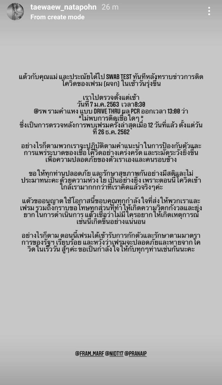 ជាក់ស្ដែងនៅពេលពាក់កណ្ដាលយប់នៅថ្ងៃទី 7 មករា តារាសម្ដែងស្រី Taew Natapohn បានផុសសារតាមរយៈ IG story ជាការបញ្ជាក់អះអាងថា ខ្លួនហើយនិងអ្នកម៉ាក់ព្រមជាមួយសង្សា បានធ្វើដំណើរទៅត្រួតពិនិត្យមើលមេរោគកូវីត 19រួចរាល់អស់ហើយ លទ្ធផលចេញមកមិនមានមេរោគអ្វីទាំអស់ ជាការត្រួតពិនិត្យបន្ទាប់ពីបានជួបអ្នកគ្រប់គ្រងផ្ទាល់ខ្លួនថ្ងៃចុងក្រោយនៅថ្ងៃទី 26 ធ្នូ គឺ 12ថ្ងៃមកហើយ ព្រមទាំងបញ្ជាក់ពីពត៌មានរបស់អ្នកគ្រប់គ្រងផ្ទាល់ខ្លួនដែលថាពេលនេះគាត់បានទទួលការព្យាបាលរួចជាស្រេចហើយ។ ទាំងអស់នេះនាងបានបើតគូទដោយពាក្យអគុណចំពោះកំលោះចិត្តដែលបានផ្ញើរមកឲ្យ ហើយក៏សុំទោសគ្រប់គ្នាដែលធ្វើឲ្យមានការព្រួយបារម្ភព្រមទាំងប្រាប់ឲ្យគ្រប់គ្នាមានសុវិត្តភាពថែរក្សាសុខភាពយ៉ាងមានសតិ