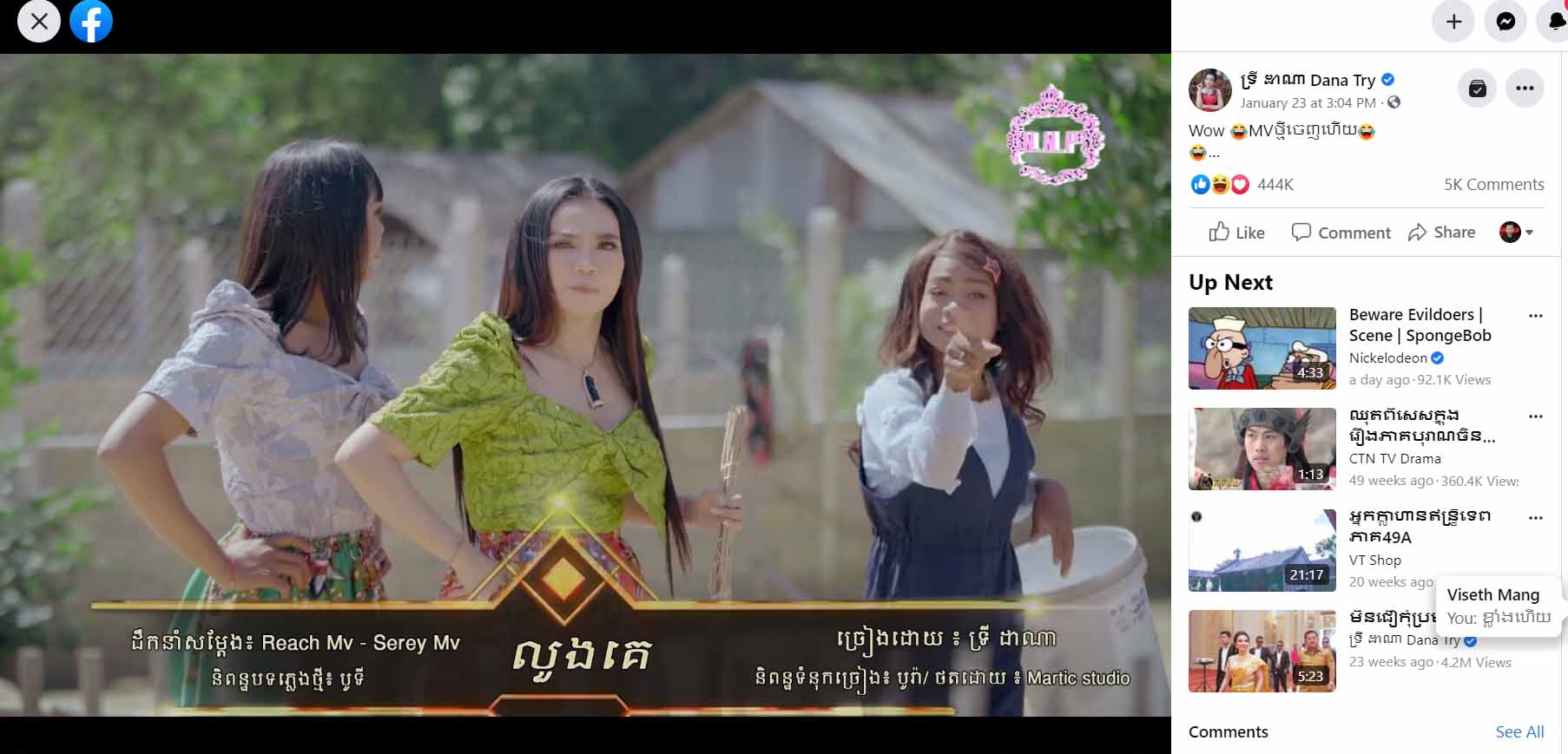 ស្នាដៃថ្មីរបស់អ្នកស្រី ទ្រី ដាណា ដែលផ្ទុះការគាំទ្រខ្លាំងនៅលើបណ្តាញសង្គមហ្វេសប៊ុកលើកនេះ បទចម្រៀងមានចំណងជើងថា “លួងគេ”។ បទនេះ បានធ្វើឱ្យទស្សនិកជន ទស្សនាសើចស្ទើរមិនចង់បិទ ព្រោះទស្សនីយភាពរបស់ អ្នកស្រី ទ្រី ដាណា និងស្វាមី បានសម្តែងរួម ក្នុងសកម្មភាពបែបកំប្លែង។