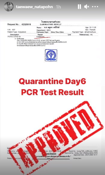 Taew Natthaporn បង្ហាញលទ្ធផលពិនិត្យកូវីដ-19 បន្ទាប់ពីស្ថិតក្នុងក្រុមអ្នកហានិភ័យខ្ពស់ក្នុងការនៅជិតដិតជាមួយនិង DJ matoom ព្រមទាំងមាន comment ឆ្លើយតបត្រេកអឲ្យឈប់តាមដានបានប្រសិនបើមានការរំខាន