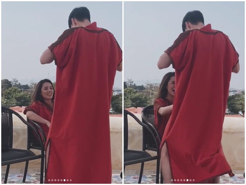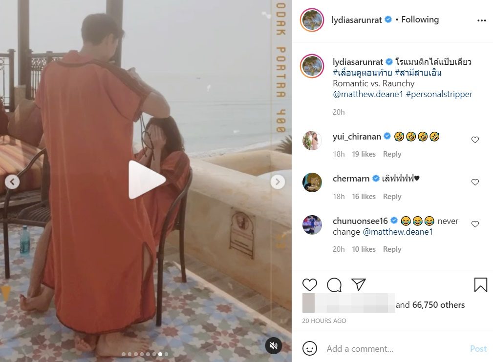 ប៉ុណ្ណឹងមិនទាន់គ្រប់អស់ទេ លោកស្វាមីនៅមានថែមឲ្យមួយក្បាច់ទៀតក្បាច់យោគដៃយោគជើង មុននិងយួរកាបូបចូលបន្ទប់ ដល់ថ្នាក់ Lydia យកវីឌីអូនេះមកផុសបង្អាប់ស្វាមីក្នុង IG ថា “រ៉ូមែនទិចបានតែបន្ទិច មើលដល់ចប់ លោកស្វាមីខ្សែញាក់”