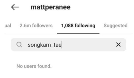 មិនដឹងថាមានរឿងអ្វីកើតឡើងចំពោះគូស្នេហ៍ផ្អែមល្ហែម Matt-Songkran ព្រោះគ្រប់គ្នាសង្កេតឃើញថាខាងស្រីមិនបាន follow Instagram របស់កំលោះ Songkran ទៀតហើយ ដោយមុននេះនៅមានរូបភាពសកម្មភាពផ្អែមល្ហែមបង្ហាញមកឲ្យឃើញសោះ ដូចជាពេលដែលនាងបានប្ដូរពណ៌សក់ ហើយខាងប្រុសក៏មានបង្អាប់លេងជាមួយទៀតផង