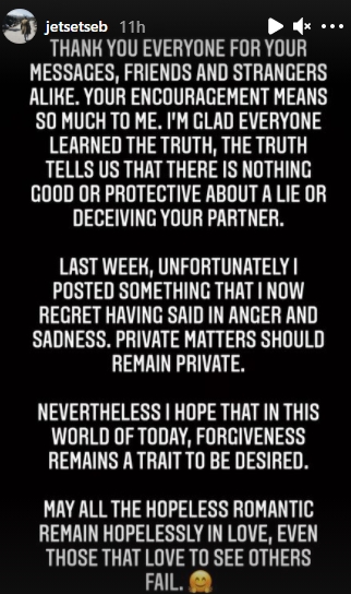 បន្ទាប់ពីក្លាយទៅជាប្រធានបទក្ដៅក្នុងកំឡុងថ្ងៃនៃក្ដីស្រលាញ់កន្លងមកនៅពេលកន្លងមកកំលោះ Sebastian Lee បានក្រោកឡើងមកផុសរឿងរ៉ាវស្នេហាដែលមានកាកុហកធ្វើអោយខូចចិត្តរហូតដល់ថ្នាក់លុបរូបភាពគូជាមួយនិង Dew arisara ចេញពី IG ចំណែកឯខាងស្រីក៏លុបចេញអស់ដូចគ្នា ព្រមទាំងមានសរសេរផុសនៅក្នុង YouTube ផ្ទាល់ខ្លួនក្នុងប្រយោគសោកសៅថា “ថ្វីត្បិតតែចុងក្រោយយើងមិនបានសមបំណងនិងគ្នា តែក៏សប្បាយចិត្តដែលអ្នកចូលមកក្នុងជីវិតជាចំណែកមួយនៅក្នុងជីវិត” អាចនិយាយបានថាធ្វើអោយអ្នកគាំទ្រសោកសៅទៅតាមដែរ
