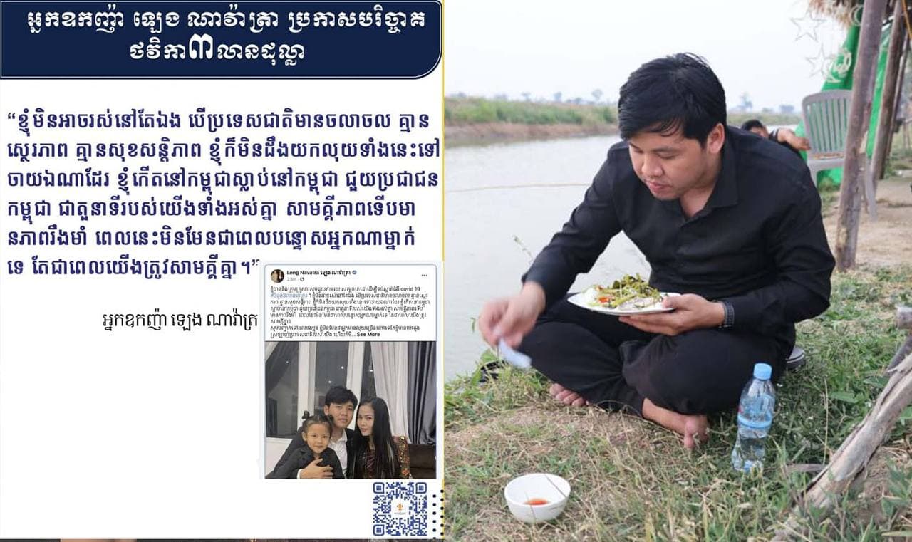 ភាសា ចេញ ពី បេះដូង ដែល និយាយ ទៅ កាន់ ជន រួម ជាតិ ដែល ឆ្លុះ បញ្ចាំង ពី ឆន្ទៈ ដ៏ មោះមុត មិន អាច កាត់ ថ្លៃ បាន ខ្លួន តូច ថ្លើម ធំ ពោរ ពេញ ទៅ ដោយ អត្ថន័យ ដ៏ ជ្រាលជ្រៅ ក្នុង ការ សាមគ្គី រួម ជា កម្លាំង ប្រឆាំងនឹងCovid 19 ជា មួយ រដ្ឋាភិបាល គ្រា ដែល ប្រទេស ជាតិ មាន ទុក្ខ។ ទទឹម គ្នា នោះ បាន ធ្វើ ឲ្យ មហាជន កោតសរសើរ ទឹក ចិត្ត អ្នក ឧកញ៉ា ឡេង ណាវ៉ាត្រា ជា ខ្លាំង។
