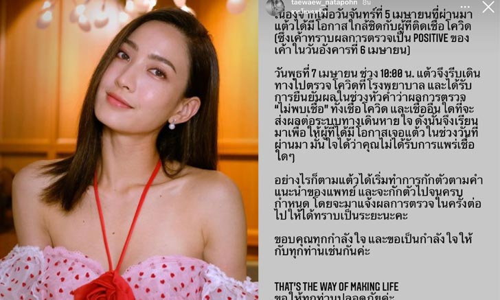 ដោយជាក់ស្ដែង Taew បានផុសសារប្រកាសនៅក្នុង IG story ថា បានប៉ះពាល់ជាមួយនិងអ្នកត្រួតឃើញមានកូវីដ-19 ហើយនាងគ្រាន់តែដឹងភ្លាមក៏ប្រញាប់ទៅត្រួតពិនិត្យ ហើយលទ្ធផលចេញមកគឹអវិជ្ចមាន មិនឃើញមានកូវីដ 19 ឬក៏រោគផ្សេងៗទេតែទោះជាយ៉ាងណានាងក៏មិនធ្វេសប្រហេសខ្លួនត្រូវតែធ្វើការឃុំ 14ថ្ងៃដូចដើម ហើយនិងត្រួតពិនិត្យម្ដងទៀតនៅពេលបន្ទាប់