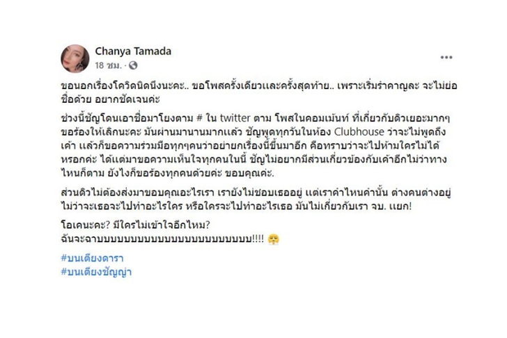 “ខ្ញុំនិយាយរាល់ថ្ងៃនៅក្នុង Clubhouse ថានិងមិននិយាយដល់គាត់ ហើយសូមអោយគ្រប់គ្នាសហការណ៍កុំយករឿងនេះនិយាយទៀត ដឹងថាមិនអាចហាមនរណាបាន បានត្រឹមតែមកសុំចិត្តអ្នកគ្រប់គ្នា ខ្ញុំមិនចង់មានចំណែករួមទាក់ទងនិងគាត់ទៀត មិនខ្វល់ថាក្នុងផ្លូវណាក៏ដោយ យ៉ាងណាក្ដីសុំចិត្តដល់អ្នកគ្រប់គ្នាផង អគុណចា”