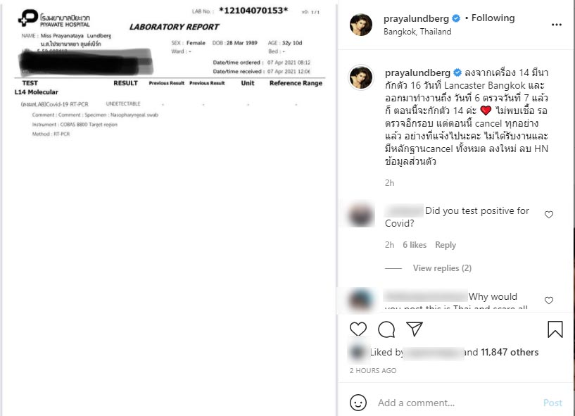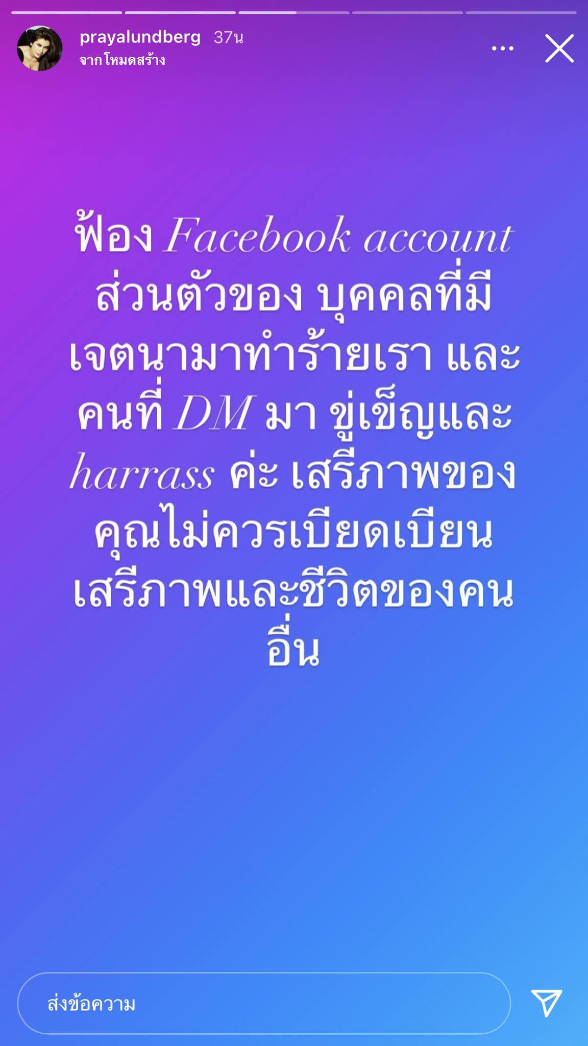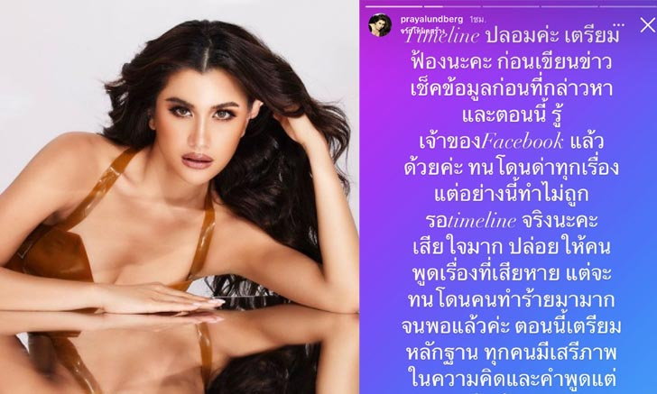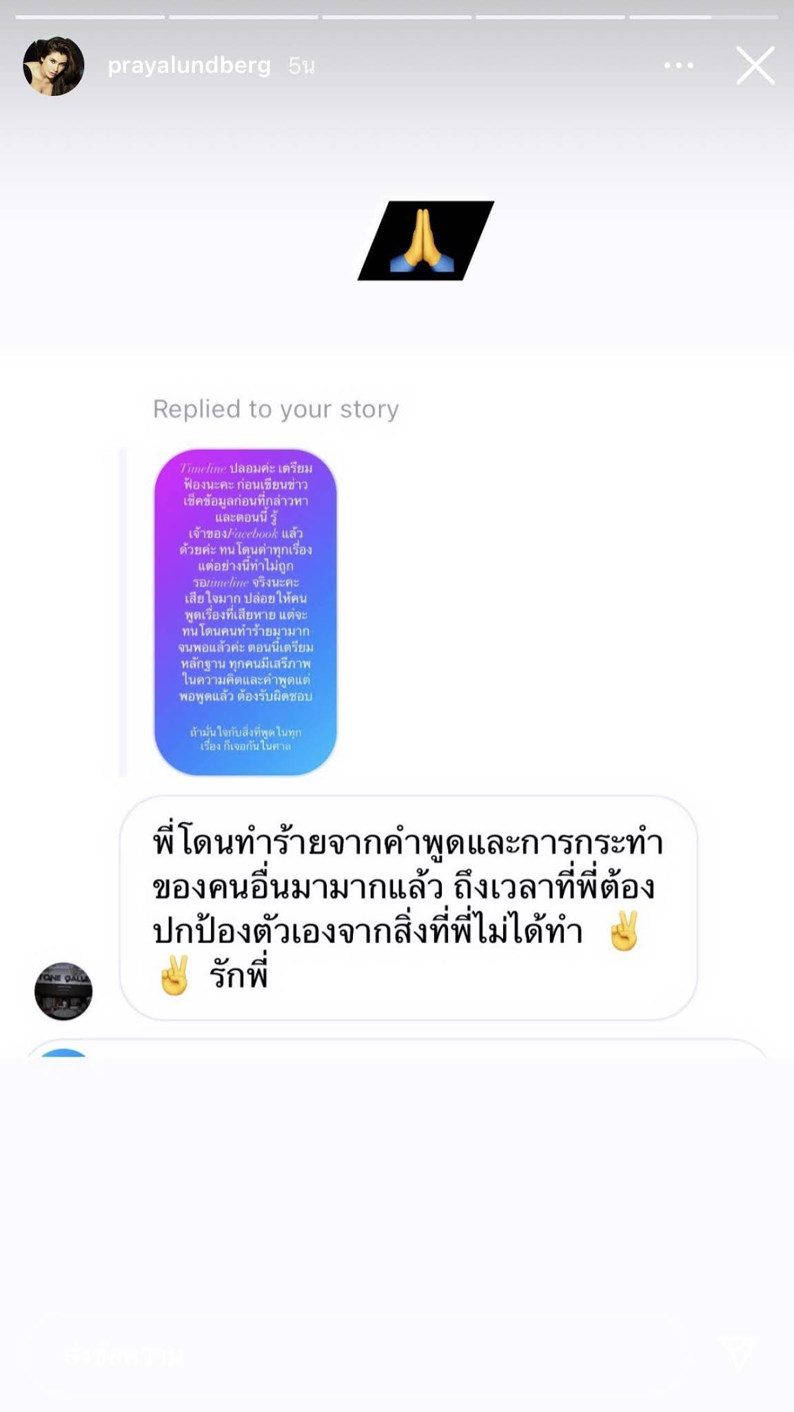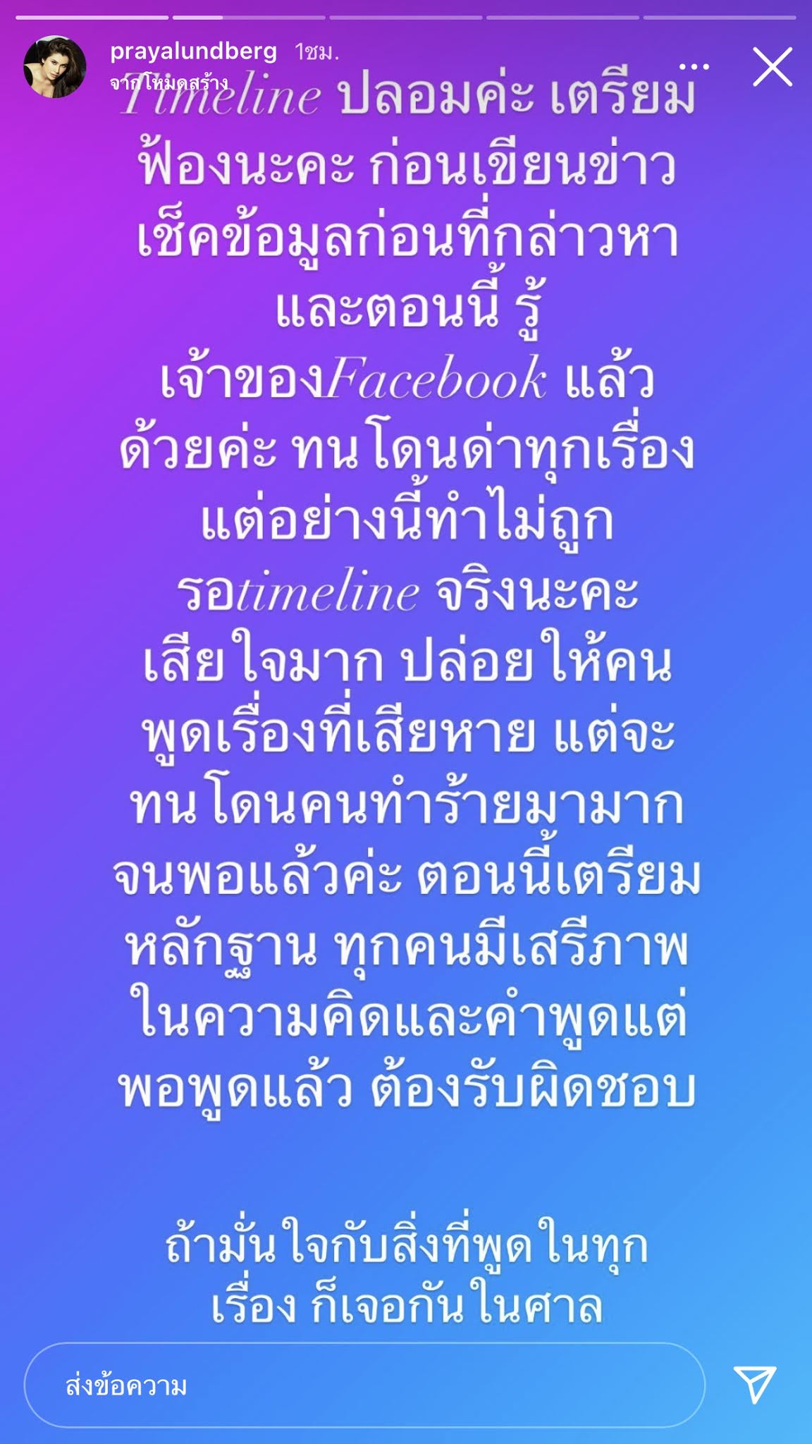ដោយភាពជាក់ស្ដែង Pu Praya បានផុសសារនៅក្នុង IG story @prayalundberg ថា “Timeline ក្លែងក្លាយចា ត្រៀមនិងប្ដឹងហើយ មុននិងសរសេរពត៌មានមុននិងចោទប្រកាន់អ្នកណាសូមពិនិត្យអោយច្បាស់សិនហើយពេលនេះស្គាល់ម្ចាស់ Facebook ហើយផងដែរ ទ្រាំគេជេរគ្រប់រឿង តែបែបនេះធ្វើមិនត្រូវ ចាំ Timeline ពិតណាចា